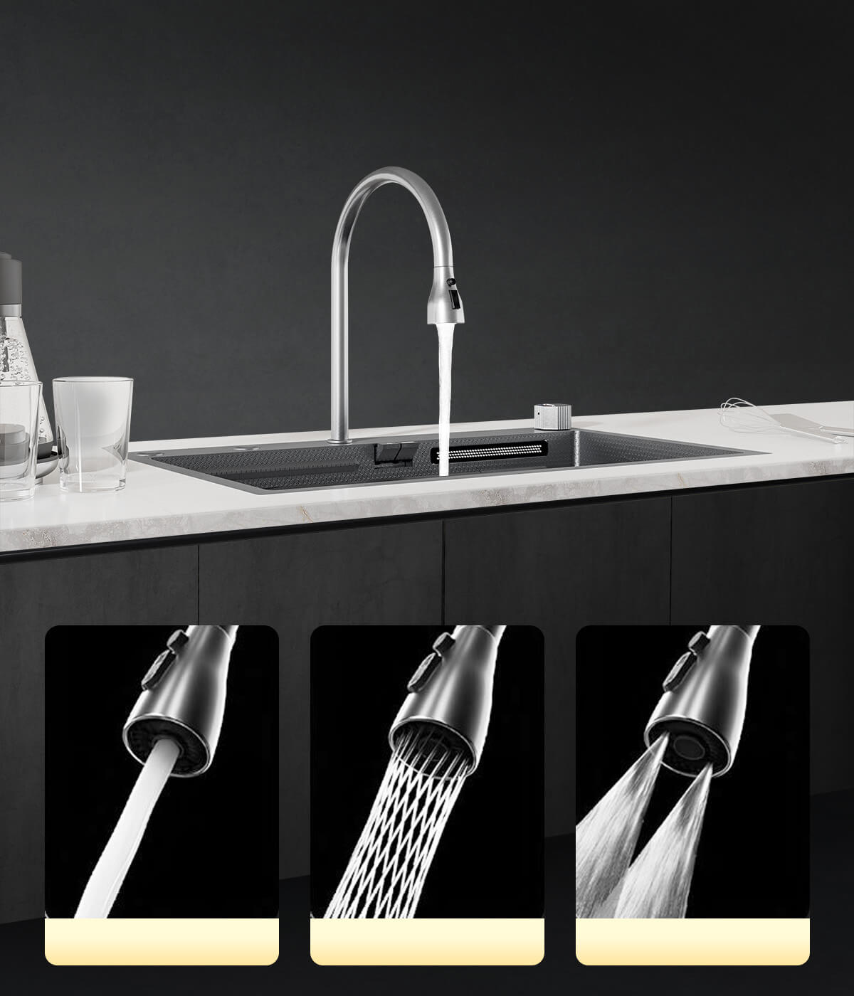Phun thác nước: Dòng nước mạnh, trải rộng, giúp rửa sạch thực phẩm nhanh chóng.