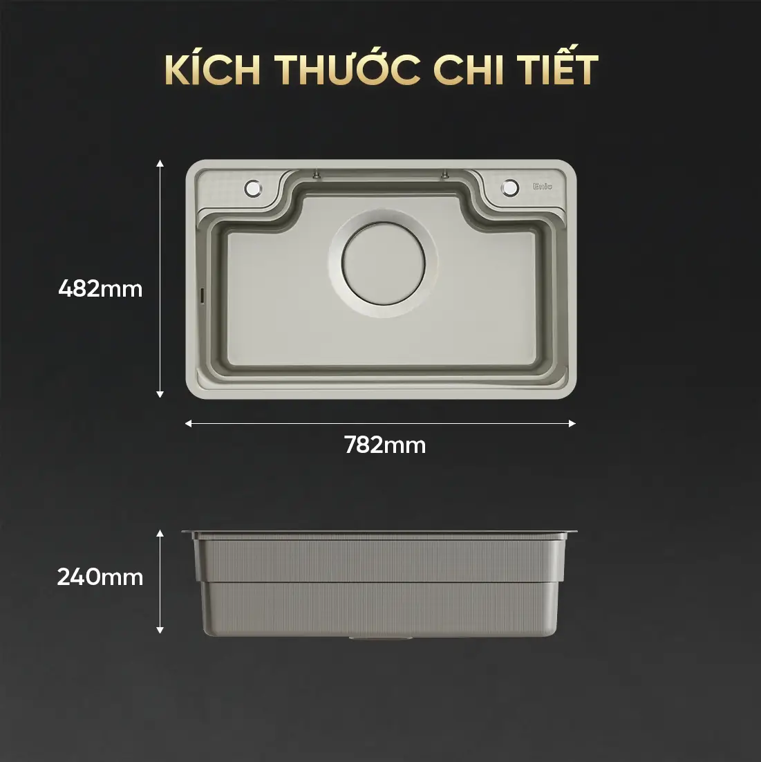 Bồn rửa chén Enic MB02 được chế tạo từ inox SS304 cao cấp, đảm bảo khả năng chống gỉ sét, chống ăn mòn và độ bền tối ưu trong môi trường bếp ẩm ướt. Thiết kế một ngăn rộng rãi (782x482x230mm) giúp bạn dễ dàng thao tác với các vật dụng lớn. Đặc biệt, bề mặt bồn có lớp vân hạt độc đáo, giúp chống đọng nước hiệu quả, giữ khu vực bồn luôn sạch sẽ.