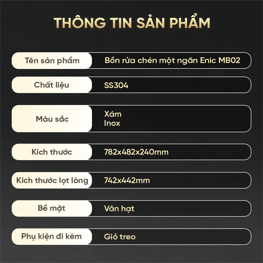 Nâng cấp không gian nấu nướng của bạn với bồn rửa chén một ngăn Enic MB02 – một thiết bị nhà bếp không thể thiếu, kết hợp hoàn hảo giữa thẩm mỹ hiện đại và công năng vượt trội.