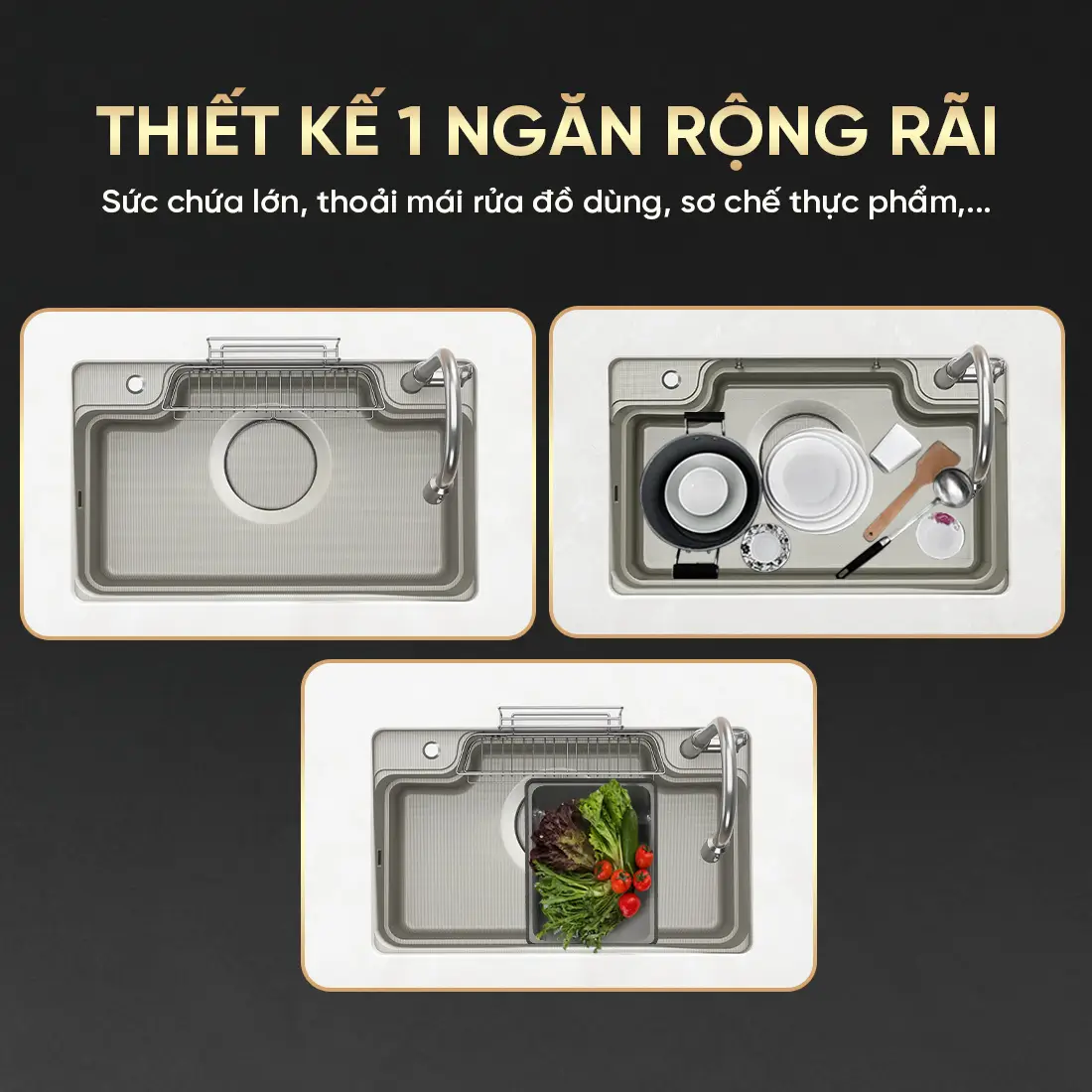 1 ngăn thôi , thkế lắp âm , có khay treo , vòi nước lọc, vời rửa. ổn áp nhà ai bếp nhỏ thì nên cân nhắc bồn này nha,