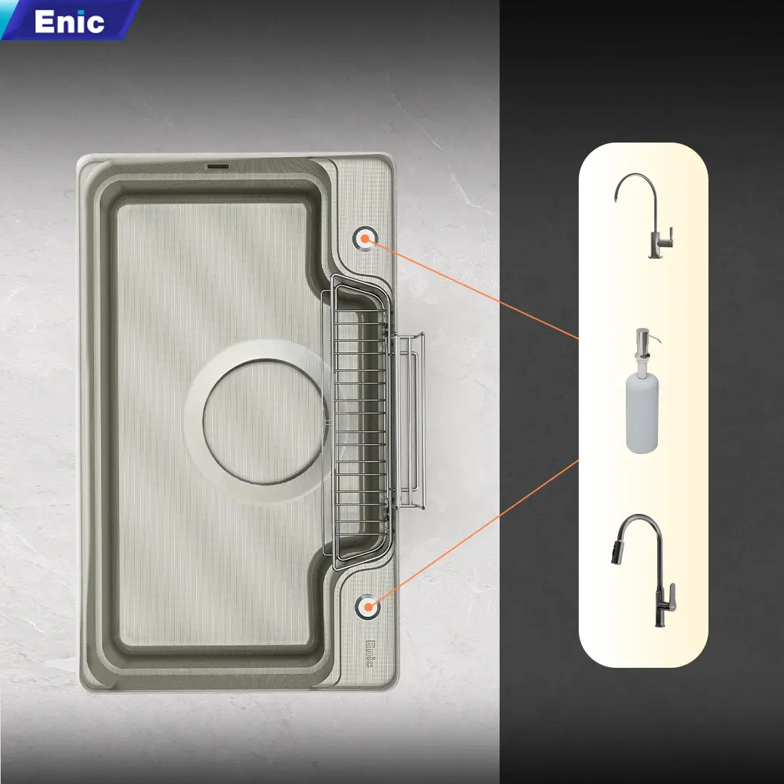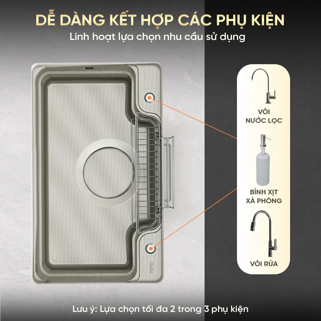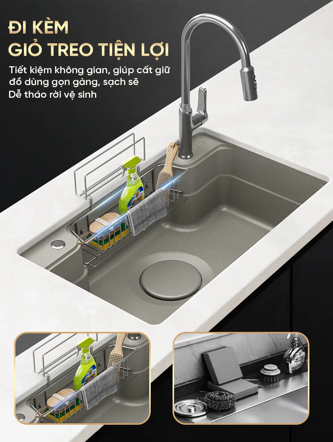 Sản phẩm đi kèm giỏ treo đựng đồ tiện lợi. Enic MB02 được thiết kế để tối ưu hóa không gian, cho phép bạn tích hợp thêm hai thiết bị nhà bếp khác như vòi rửa, vòi nước lọc hoặc bình xịt xà phòng. Với yêu cầu lắp âm, bồn tạo nên một mặt bếp liền mạch, gọn gàng và sang trọng.
