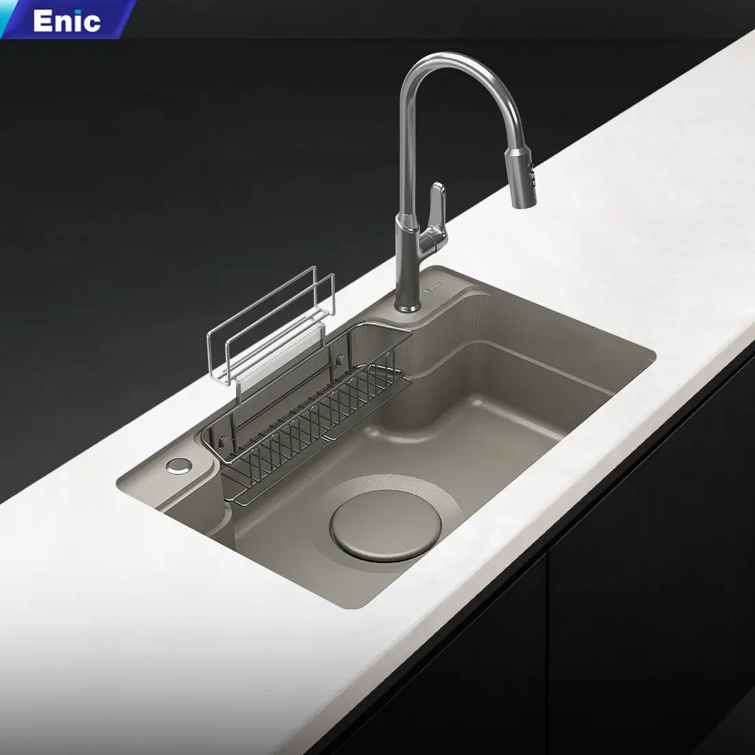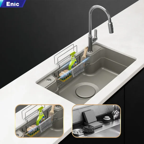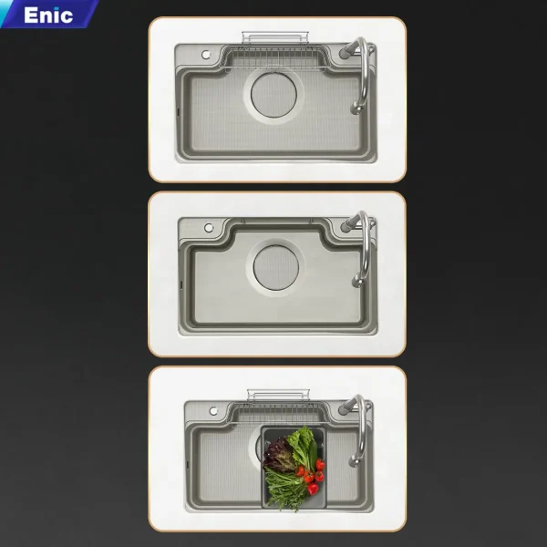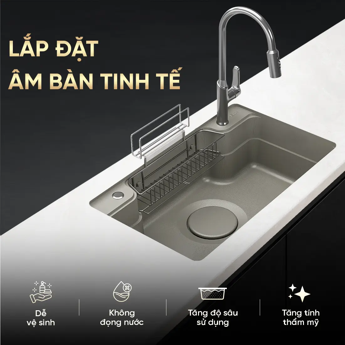 Sản phẩm đi kèm giỏ treo đựng đồ tiện lợi. Enic MB02 được thiết kế để tối ưu hóa không gian, cho phép bạn tích hợp thêm hai thiết bị nhà bếp khác như vòi rửa, vòi nước lọc hoặc bình xịt xà phòng. Với yêu cầu lắp âm, bồn tạo nên một mặt bếp liền mạch, gọn gàng và sang trọng.