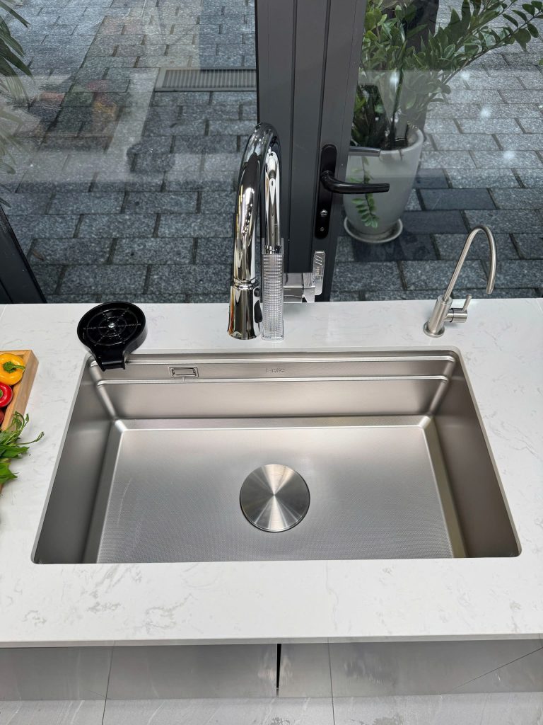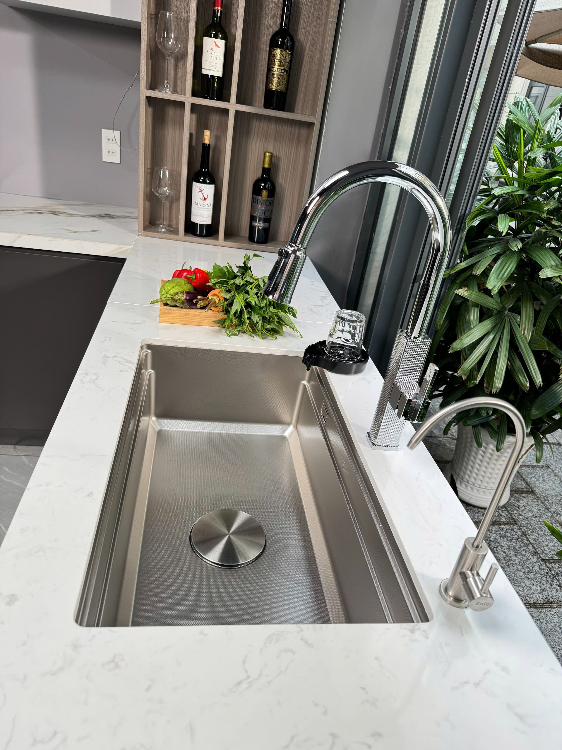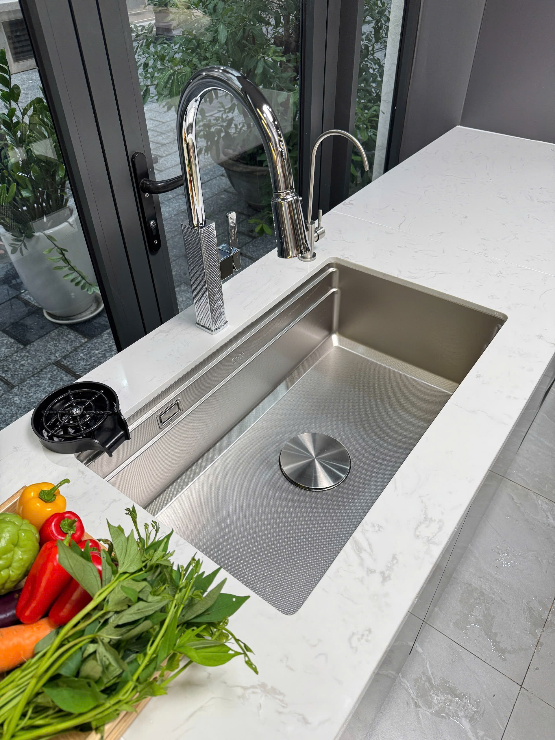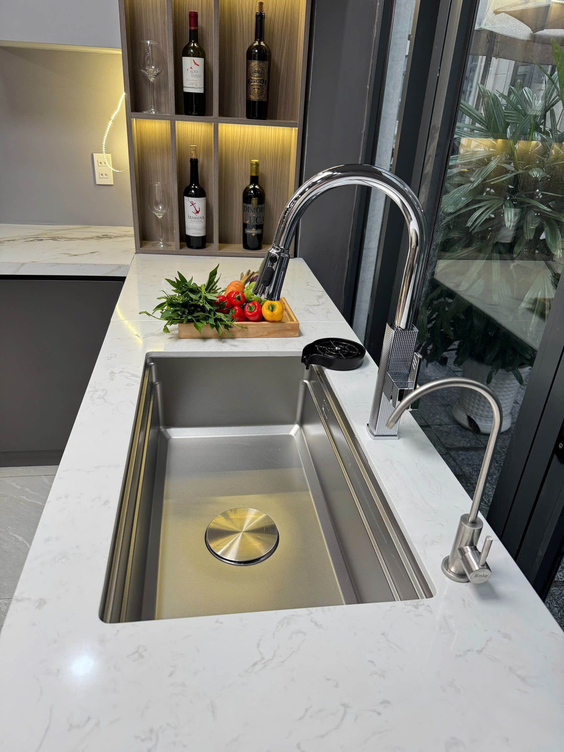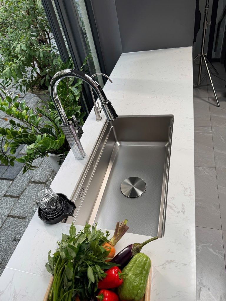 e này mạ pvd khá đeppj. khá cứng cáp, ai mua nên cân nhắc quất thêm cái vòi enic nx cho nó đồng bộ chứ nhà mik đây lắp vòi inox hãng khá nó bị lặc quẻ :
