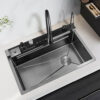 Thiết bị cho nhà bếp nổi bật với màn hình LED hiển thị nhiệt độ nước, cùng hệ thống đèn LED quanh bồn. Bảng điều khiển phím đàn thông minh với 4 chức năng: vòi rửa dây rút đa chế độ (phun tạo bọt, phun cánh hoa, phun tia mạnh), rửa thác nước, rửa tia nước, và xịt rửa cốc. Van điều chỉnh nhiệt độ nước nóng – lạnh linh hoạt, cùng van điều chỉnh thoát nước tiện dụng, mang đến sự tối ưu trong quá trình sử dụng.