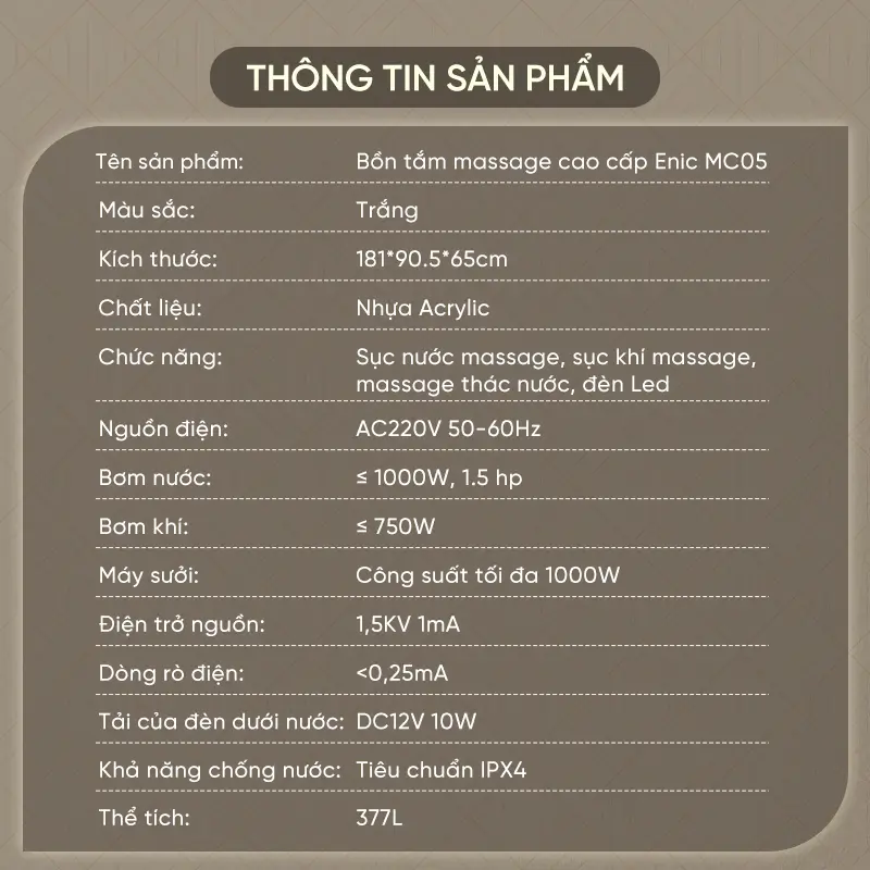 >> Tham khảo: Bồn tắm massage cao cấp Enic MC06