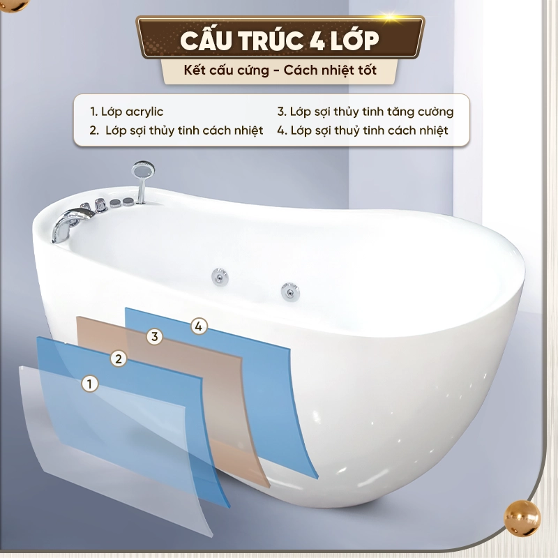 Bồn tắm massage Oval Enic M01 được chế tạo từ chất liệu Acrylic 4 lớp, có kết cấu cứng cáp, chống thấm nước và cách nhiệt vượt trội, đảm bảo độ bền và sự an toàn trong quá trình sử dụng.