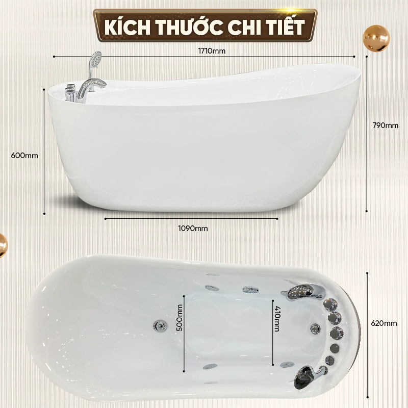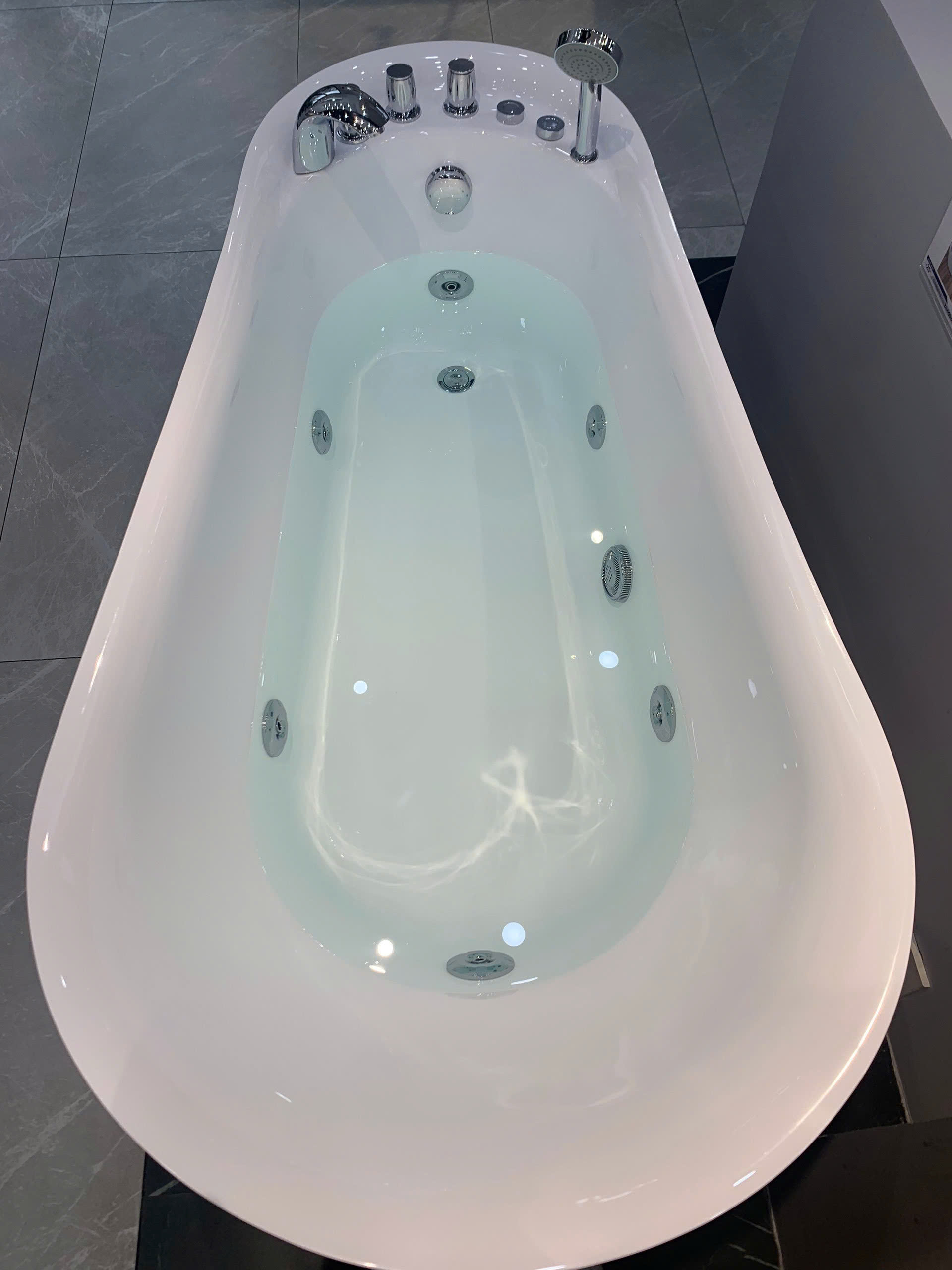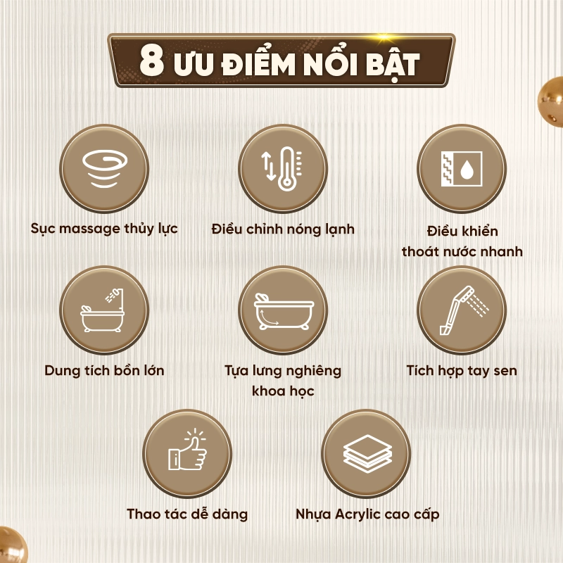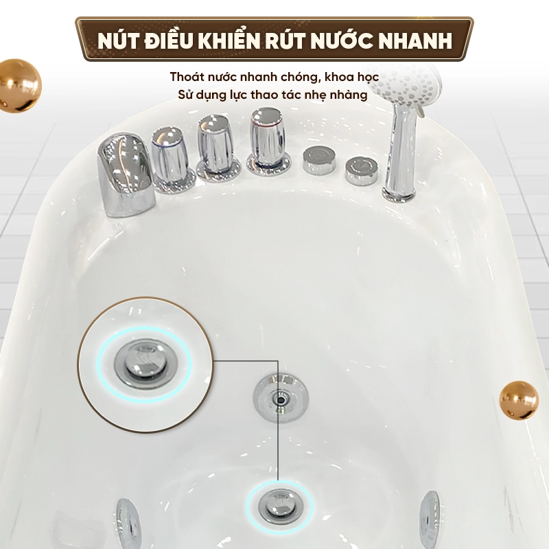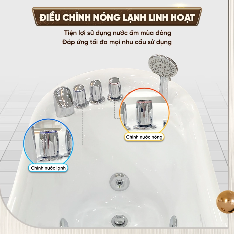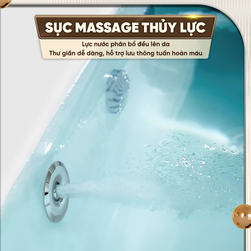 Bồn tắm được trang bị hệ thống sục massage thủy lực tiên tiến, giúp phân bố nước đều lên da, giảm căng thẳng và kích thích tuần hoàn máu. Van điều chỉnh nóng lạnh linh hoạt, cùng hệ thống nút điều khiển chức năng dễ sử dụng, kết hợp với tay sen tích hợp mang lại sự tiện lợi tối đa.