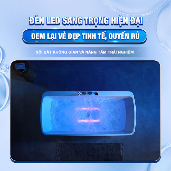 Điểm nhấn của thiết bị vệ sinh này là hệ thống đèn LED hiện đại, kết hợp với Bluetooth, cho phép bạn tận hưởng không gian thư giãn đầy phong cách. Các nút điều khiển tiện lợi giúp quản lý dễ dàng các chức năng như vòi sen, tay sen, đèn LED và xiphong thoát nước. Với công suất định mức 1050W, tổng công suất máy bơm nước 2250W và công suất bơm khí 300W, sản phẩm hoạt động ổn định và bền bỉ, đạt tiêu chuẩn an toàn IPX5.
