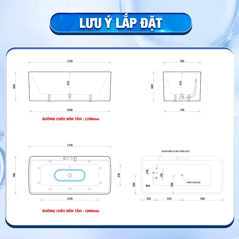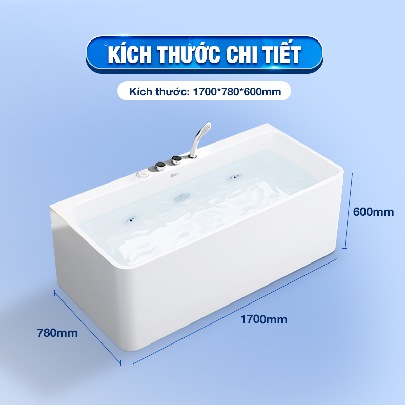Điểm nhấn của thiết bị vệ sinh này là hệ thống đèn LED hiện đại, kết hợp với Bluetooth, cho phép bạn tận hưởng không gian thư giãn đầy phong cách. Các nút điều khiển tiện lợi giúp quản lý dễ dàng các chức năng như vòi sen, tay sen, đèn LED và xiphong thoát nước. Với công suất định mức 1050W, tổng công suất máy bơm nước 2250W và công suất bơm khí 300W, sản phẩm hoạt động ổn định và bền bỉ, đạt tiêu chuẩn an toàn IPX5.