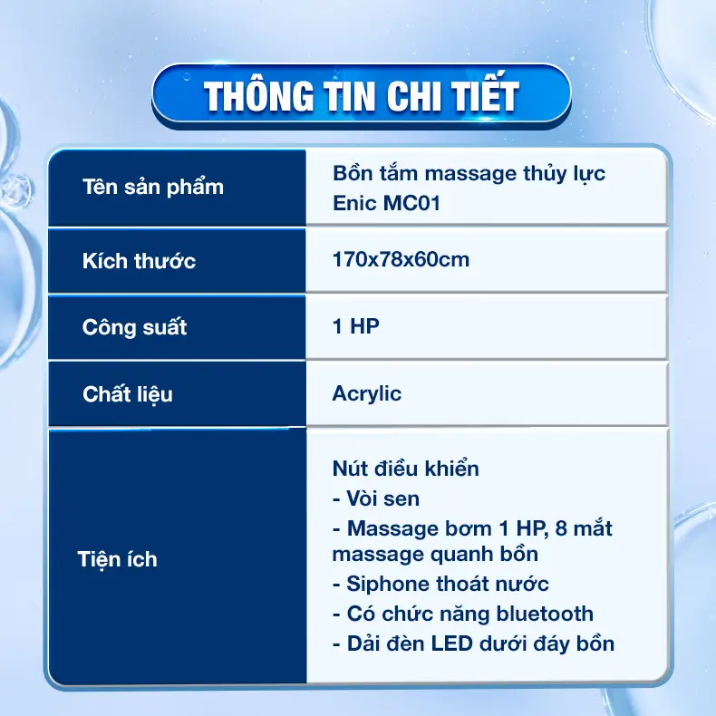 Với bồn tắm massage Enic MC01, bạn sẽ có một không gian thư giãn hoàn hảo ngay tại nhà. Đặt mua ngay bồn tắm massage Enic để cải thiện chất lượng giấc ngủ và giảm stress hiệu quả.