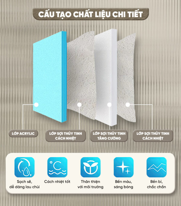 - Cấu tạo chất liệu chi tiết: lớp acrylic – lớp sợi thuỷ tinh cách nhiệt – lớp gia tăng kết cấu – lớp sợi thuỷ tinh cách nhiệt