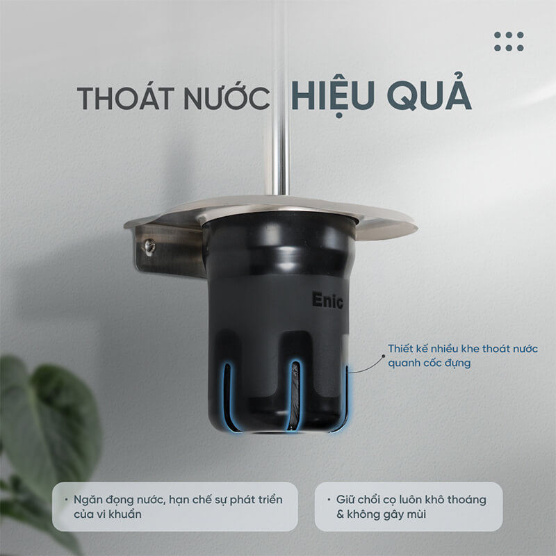 Cốc đựng thoát nước hiệu quả: Cốc đựng được thiết kế thông minh giúp nước đọng nhanh chóng thoát ra ngoài, giữ cho đầu chổi và cốc luôn khô ráo, hạn chế tối đa vi khuẩn và mùi hôi tích tụ.