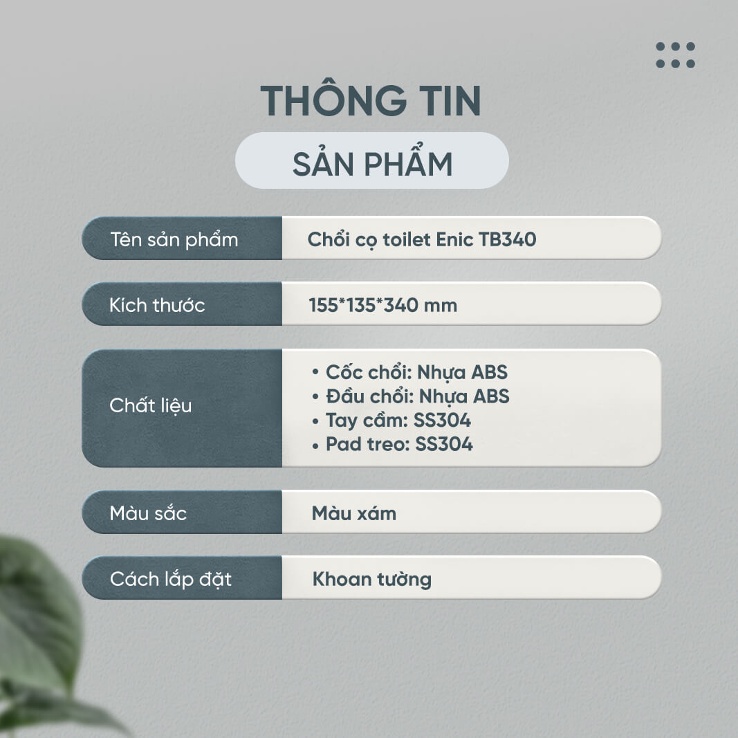 Duy trì sự sạch sẽ và khô ráo cho phòng tắm với Chổi cọ toilet Enic TB340 – một Phụ kiện nhà tắm thiết yếu được thiết kế hiện đại, giúp giải quyết vấn đề vệ sinh và lưu trữ gọn gàng.