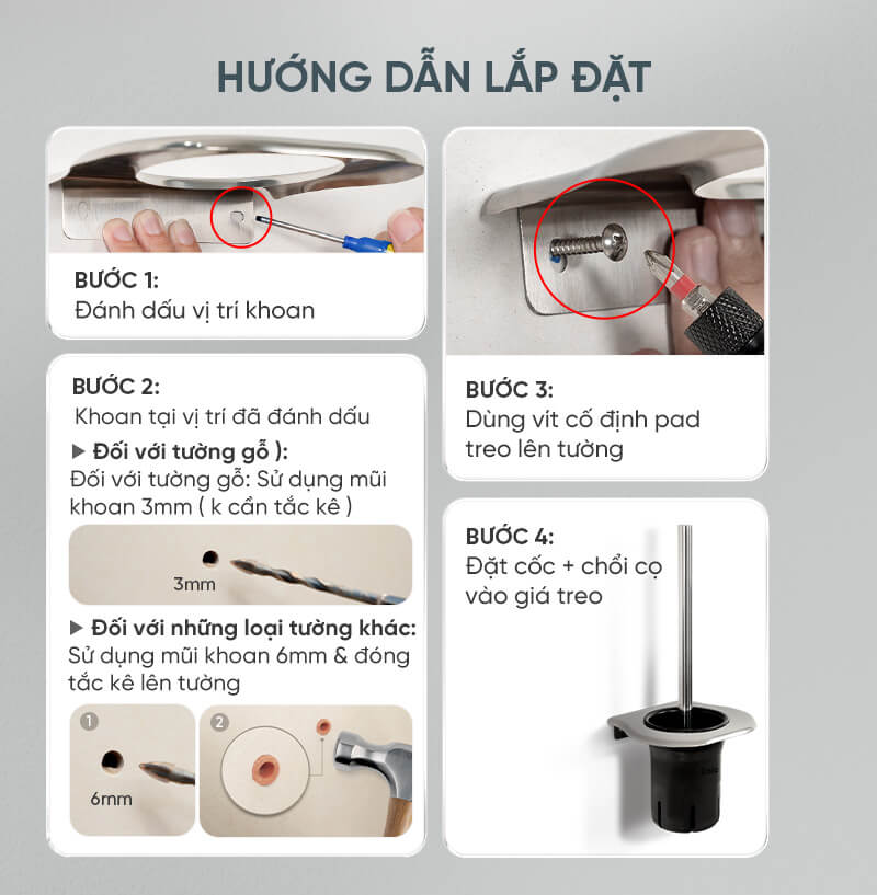 Tường Gạch/Tường Khác: Dùng mũi khoan 6mm và đóng tắc kê.