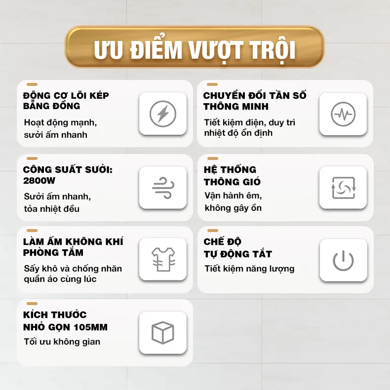 - Công nghệ sưởi gốm PTC hiện đại: thay thế cho máy sưởi truyền thống giúp diệt vi khuẩn, ẩm mốc, xua tan lạnh lẽo.