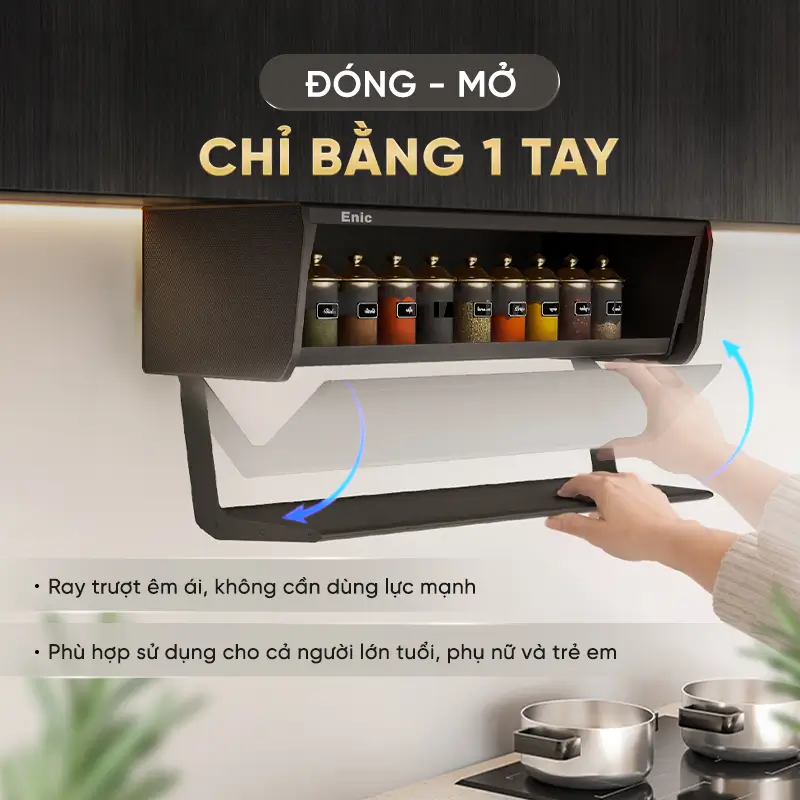 Nâng tầm thẩm mỹ và sự tiện nghi cho khoang tủ bếp với Kệ gia vị cố định cao cấp Enic Elite. Thuộc dòng sản phẩm Elite tinh tế, mẫu kệ này không chỉ là một món phụ kiện tủ bếp thông thường mà còn là giải pháp lưu trữ thông minh, giúp bảo quản gia vị luôn khô ráo, sạch sẽ và ngăn nắp.