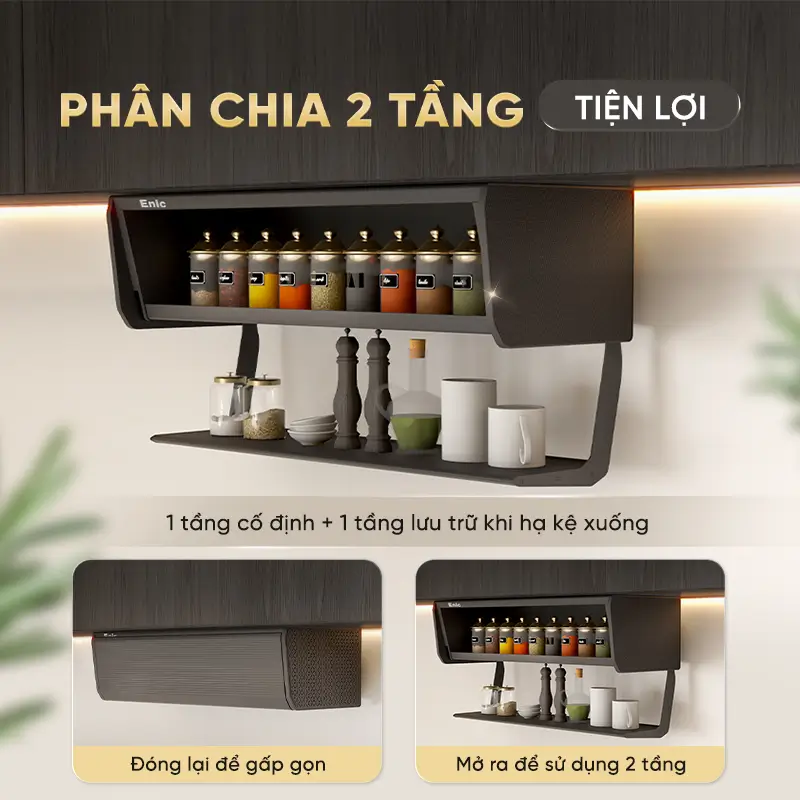Cấu trúc 2 tầng: Kệ được chia ngăn rõ rệt, giúp bạn dễ dàng phân loại chai lọ theo kích thước hoặc tần suất sử dụng, giúp thao tác nấu nướng trở nên nhanh chóng.