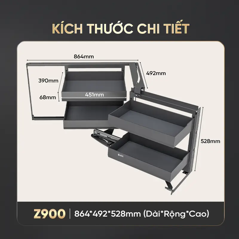 Tận dụng tối đa mọi centimet trong căn bếp với Kệ góc liên hoàn cao cấp Enic Elite Z900. Đây là món phụ kiện tủ bếp đột phá, giúp biến những “góc chết” khó tiếp cận của tủ bếp chữ L hoặc chữ U trở thành không gian lưu trữ thông minh, tiện lợi và vô cùng đẳng cấp.