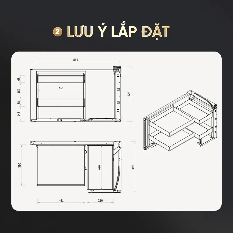 Vận hành êm ái: Hệ thống ray trượt giảm chấn cao cấp giúp mọi chuyển động kéo ra – đóng vào đều nhẹ nhàng, hoàn toàn không gây tiếng ồn.