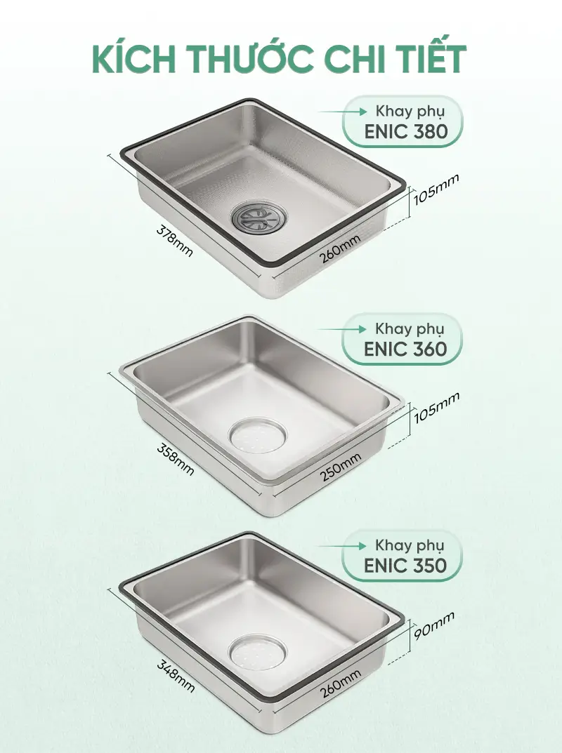 Khay phụ Enic là sự bổ sung tinh tế, biến chiếc bồn rửa chén thông thường thành trạm sơ chế đa năng, mang lại sự thuận tiện tối đa cho người nội trợ.