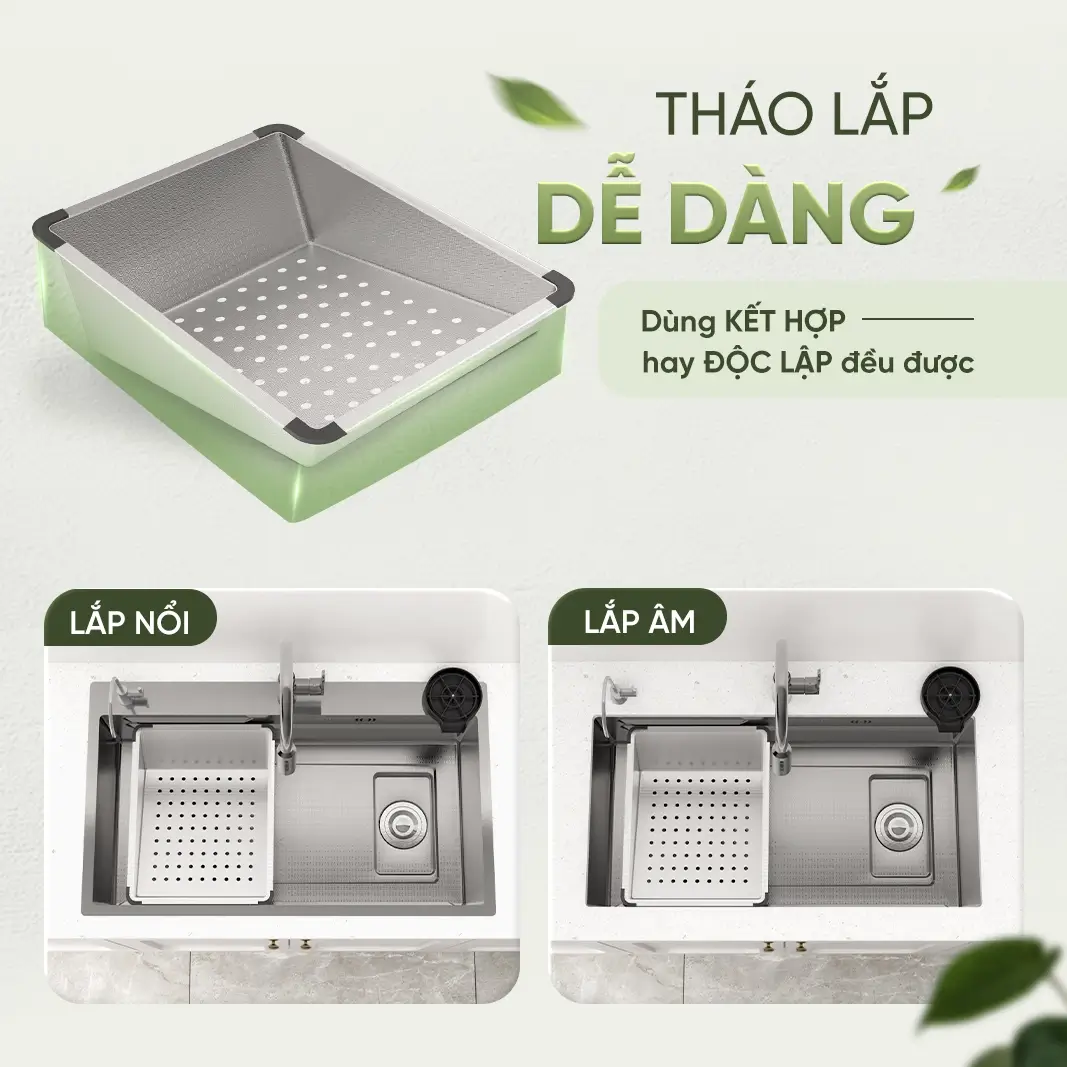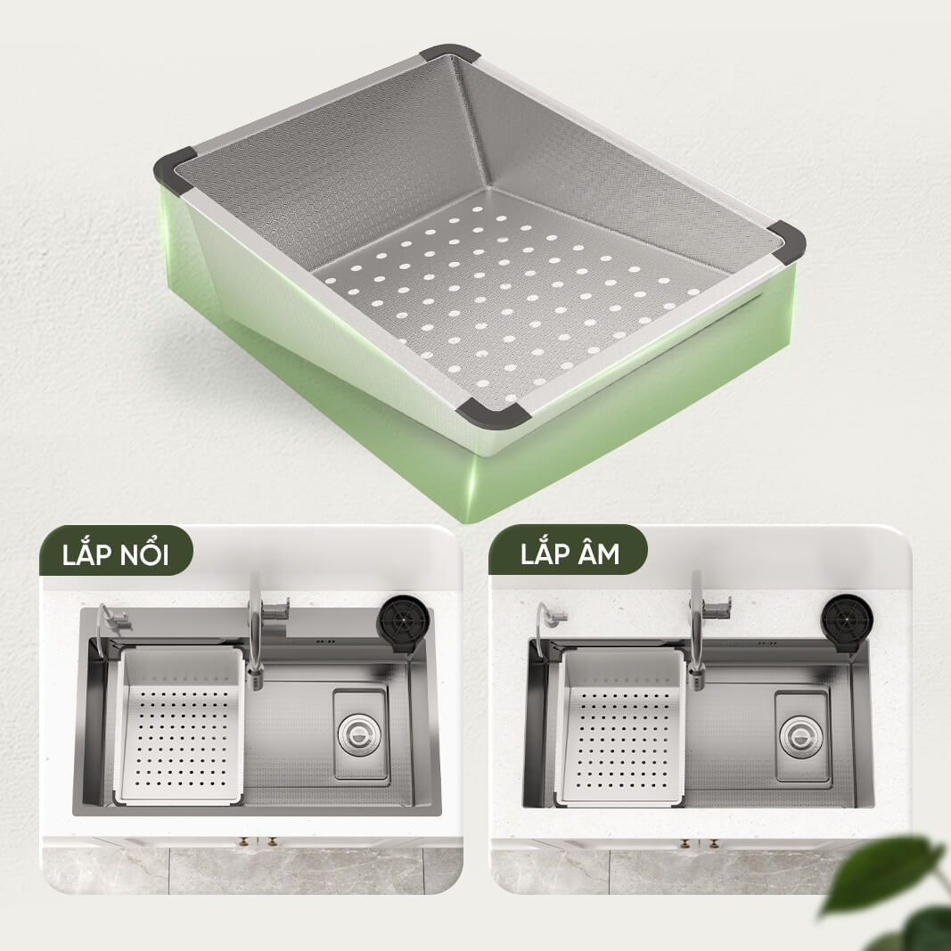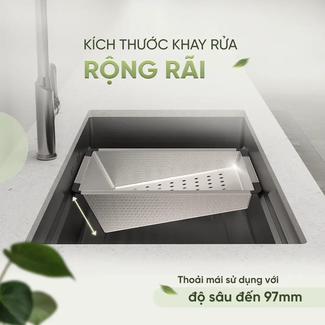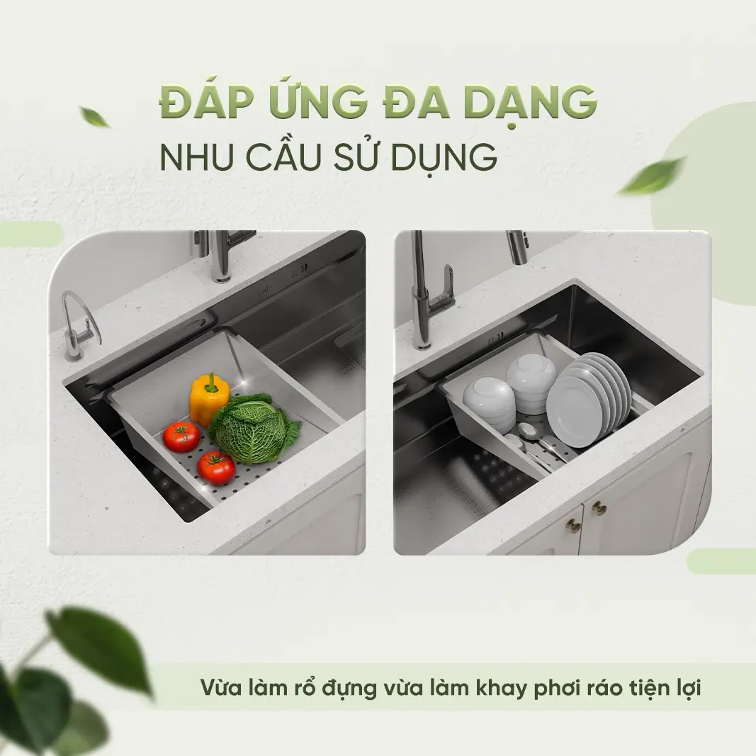 Khay sở hữu không gian chứa rộng rãi, cho phép bạn thoải mái rửa lượng lớn thực phẩm hoặc dùng để úp bát đĩa, ly cốc cho ráo nước ngay trên lòng chậu. Thiết kế thông minh này giúp nước chảy trực tiếp xuống bồn rửa chén, giữ cho mặt bàn bếp luôn khô ráo và sạch sẽ.