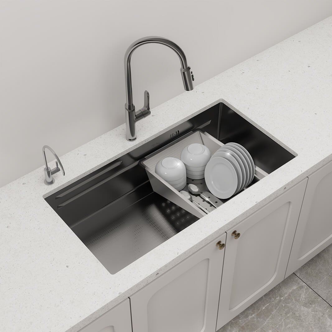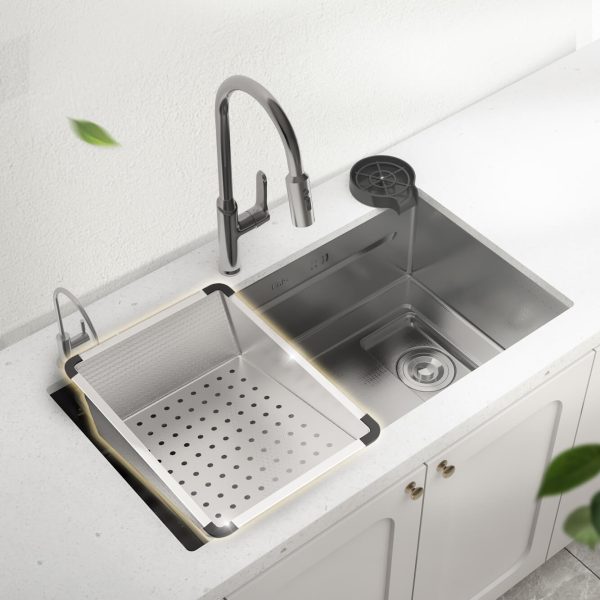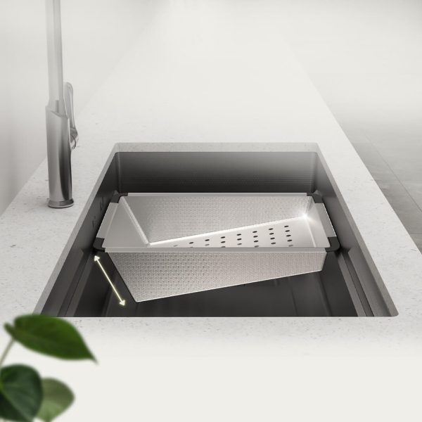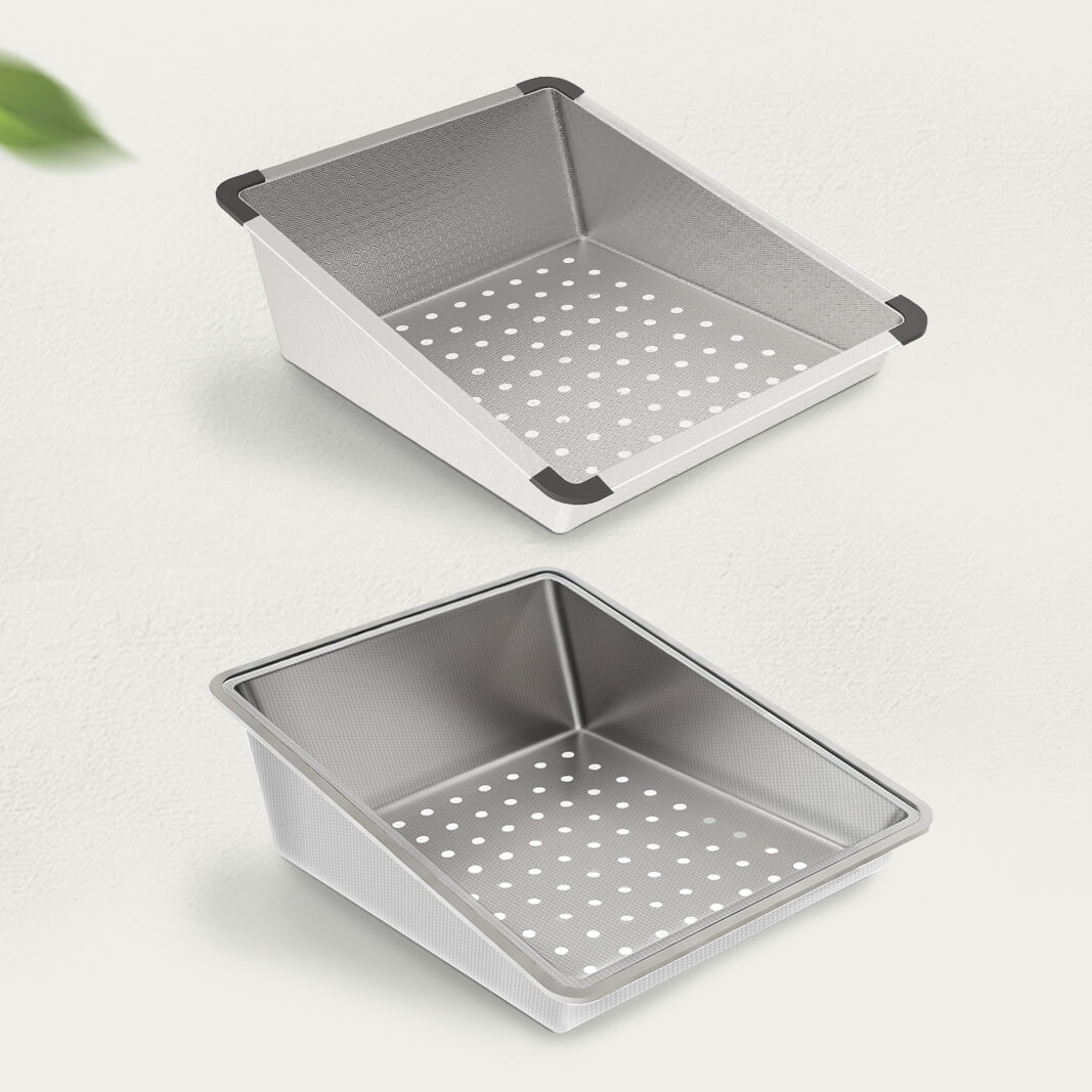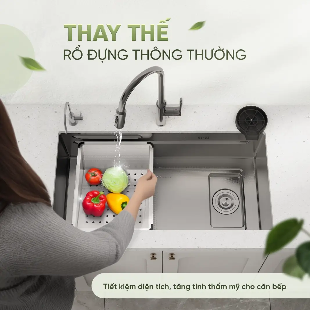 Khay sở hữu không gian chứa rộng rãi, cho phép bạn thoải mái rửa lượng lớn thực phẩm hoặc dùng để úp bát đĩa, ly cốc cho ráo nước ngay trên lòng chậu. Thiết kế thông minh này giúp nước chảy trực tiếp xuống bồn rửa chén, giữ cho mặt bàn bếp luôn khô ráo và sạch sẽ.
