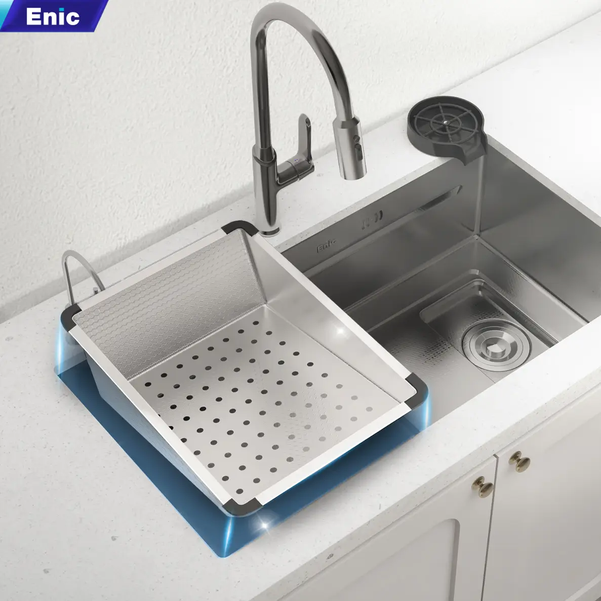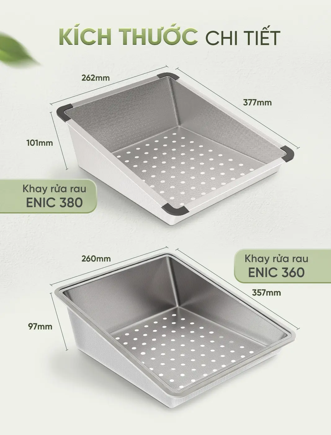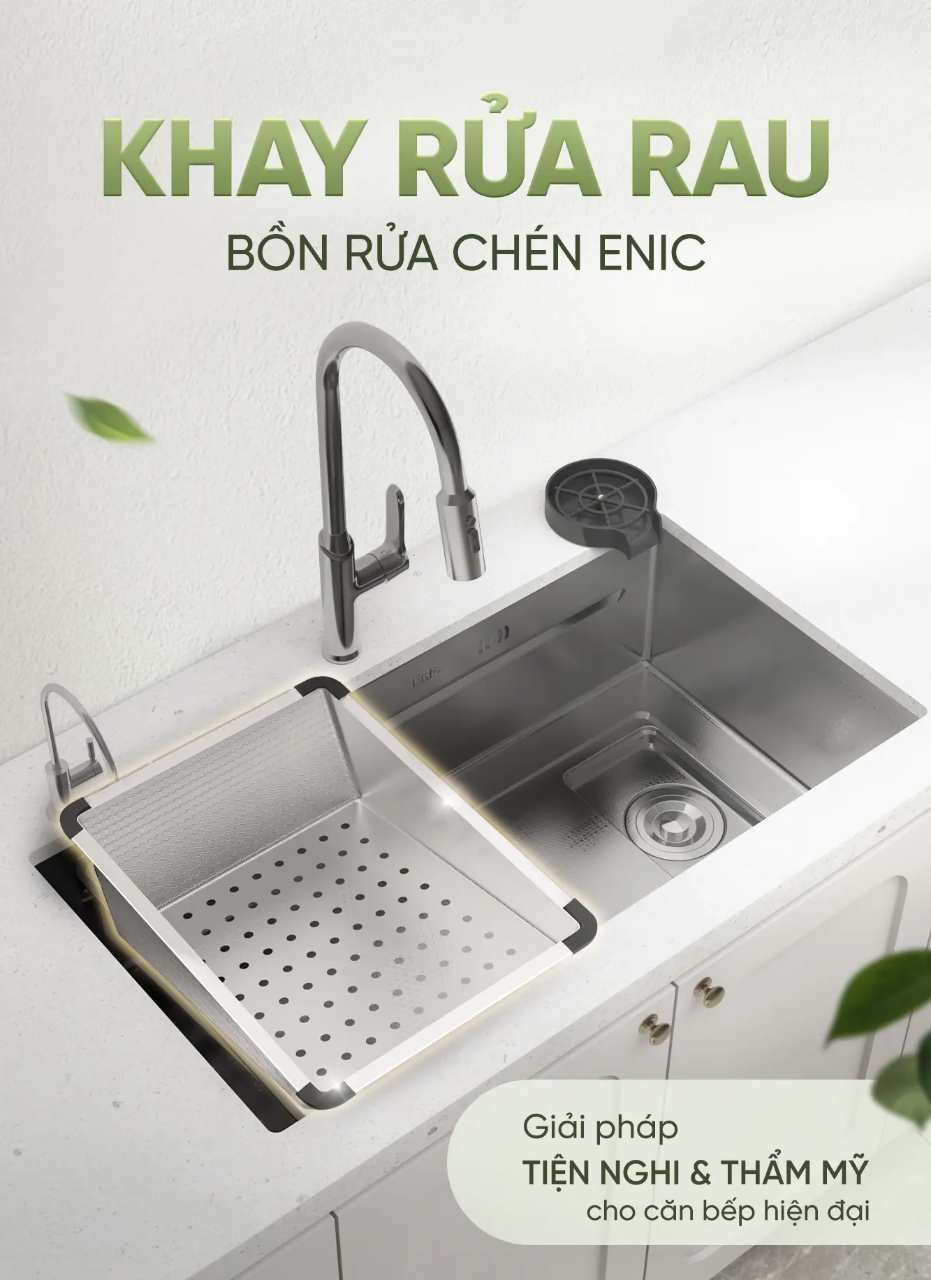Tối ưu hóa không gian sơ chế và mang lại sự gọn gàng cho căn bếp với Khay rửa rau bồn rửa chén Enic. Là một phụ kiện Thiết bị nhà bếp thiết yếu, sản phẩm này được thiết kế để kết hợp hoàn hảo với bồn rửa chén, thay thế hoàn toàn các loại rổ nhựa hay giá úp bát cồng kềnh thông thường, mang lại vẻ đẹp đồng bộ và hiện đại.