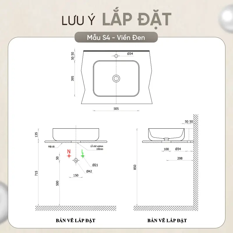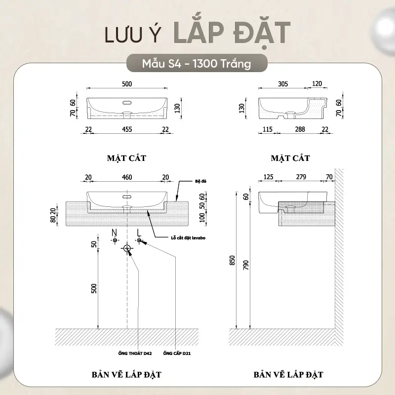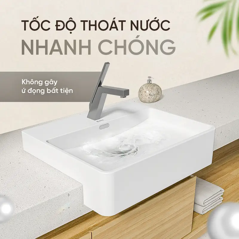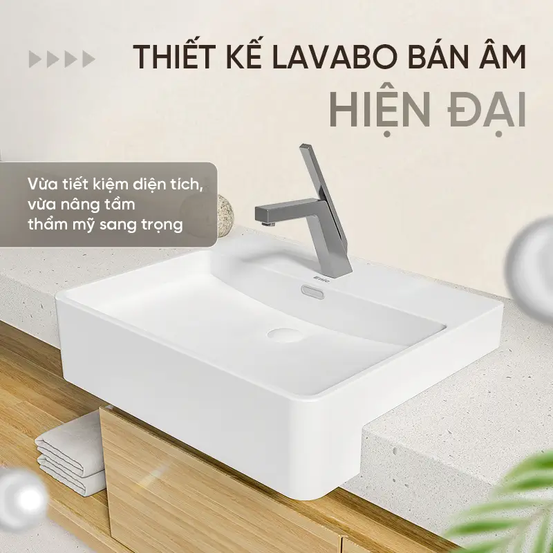 Tối ưu không gian: Khác với các dòng lavabo đặt bàn chiếm nhiều diện tích bề mặt, mẫu lavabo âm – bán âm này giúp giải phóng diện tích bàn đá phía sau, tạo khoảng trống lý tưởng để bạn sắp xếp các vật dụng cá nhân như nước rửa tay, mỹ phẩm hay nến thơm.