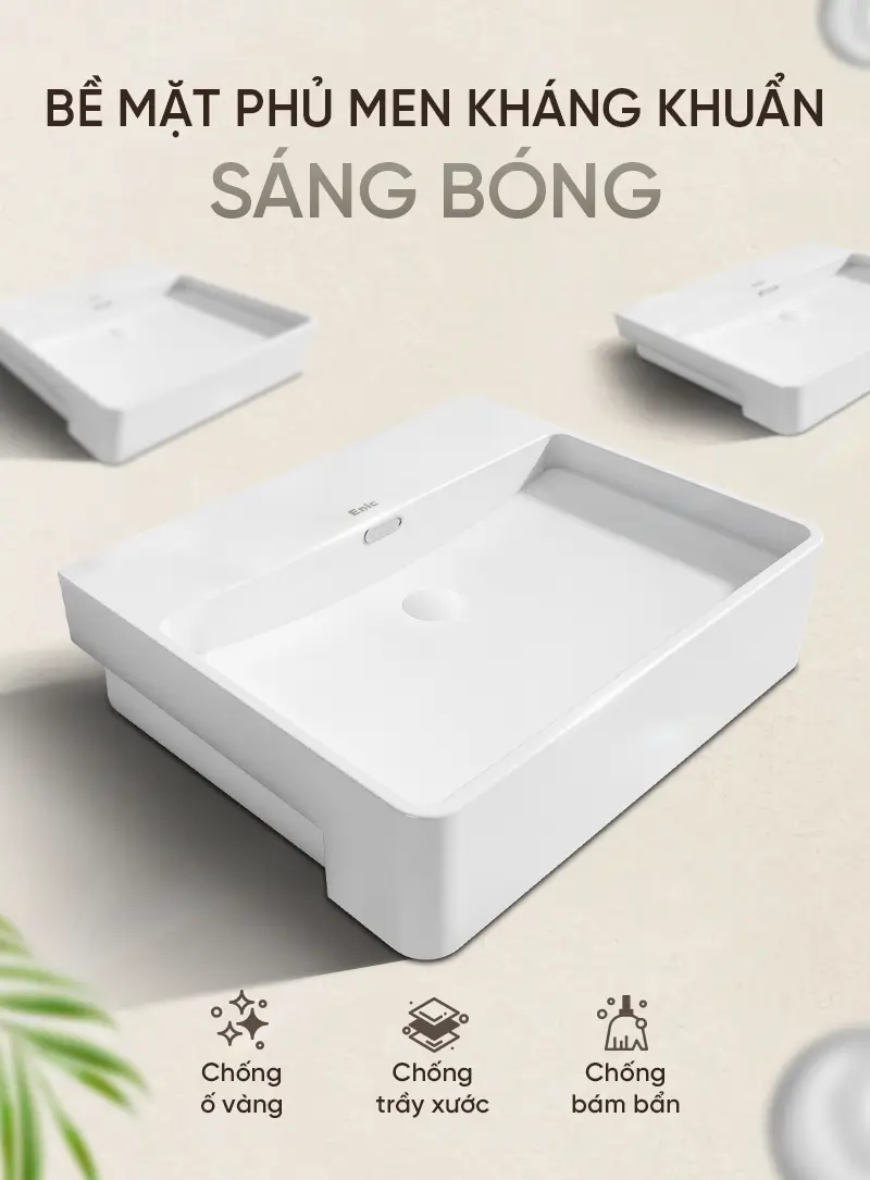 Lớp men Nano bạc: Bề mặt lavabo được phủ lớp men kháng khuẩn siêu nhẵn mịn, ngăn chặn sự phát triển của vi khuẩn và nấm mốc. Công nghệ này giúp bề mặt chậu luôn sáng bóng, chống bám bẩn và chống ố vàng cực kỳ hiệu quả.