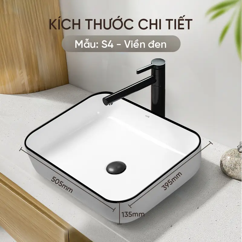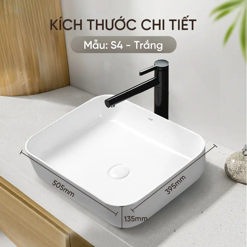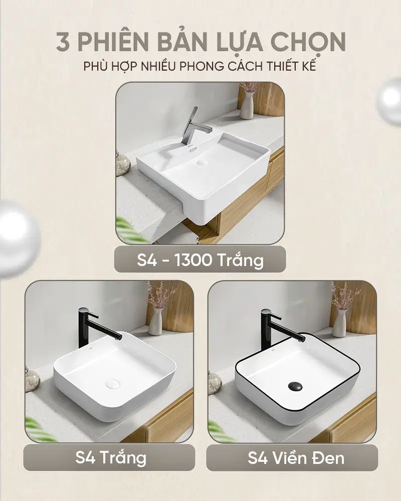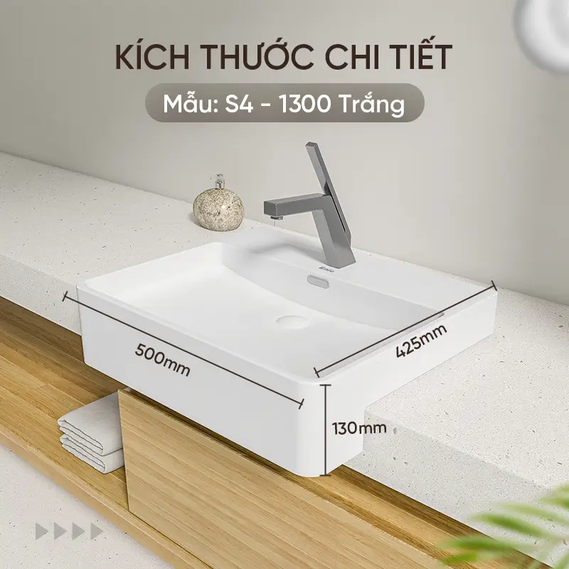 - Kích thước: 500 x 425 x 130mm, phù hợp với nhiều không gian phòng tắm, từ nhỏ gọn đến rộng rãi. Có nhiều phiên bản lựa chọn: S4 – 1300 – Trắng, S4 – Trắng, S4 – Viền đen.