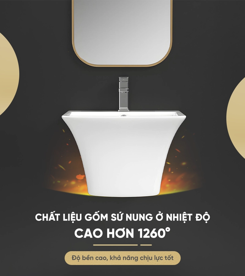 - Chất liệu gốm sứ cao cấp, bền bỉ và dễ dàng vệ sinh: Men Nano Bạc kháng khuẩn, chống bám bẩn và trầy xước, đảm bảo vệ sinh và an toàn cho sức khỏe. Quy trình nung ở nhiệt độ cao 1260, tạo độ bền và tuổi thọ sản phẩm.