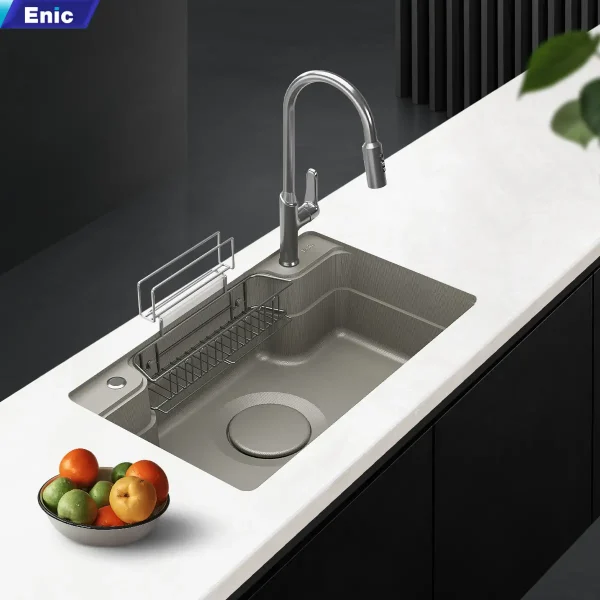 Ngoài ra, Enic còn cung cấp thêm bồn rửa chén thông minh, thiết bị nhà bếp này sẽ có phần tiện lợi và đa năng hơn, bồn rửa thiết kế rộng, sang trọng, với nhiều tính năng như: Sóng siêu âm làm sạch sâu, bảng điều khiển cảm ứng, xịt rửa ly,…