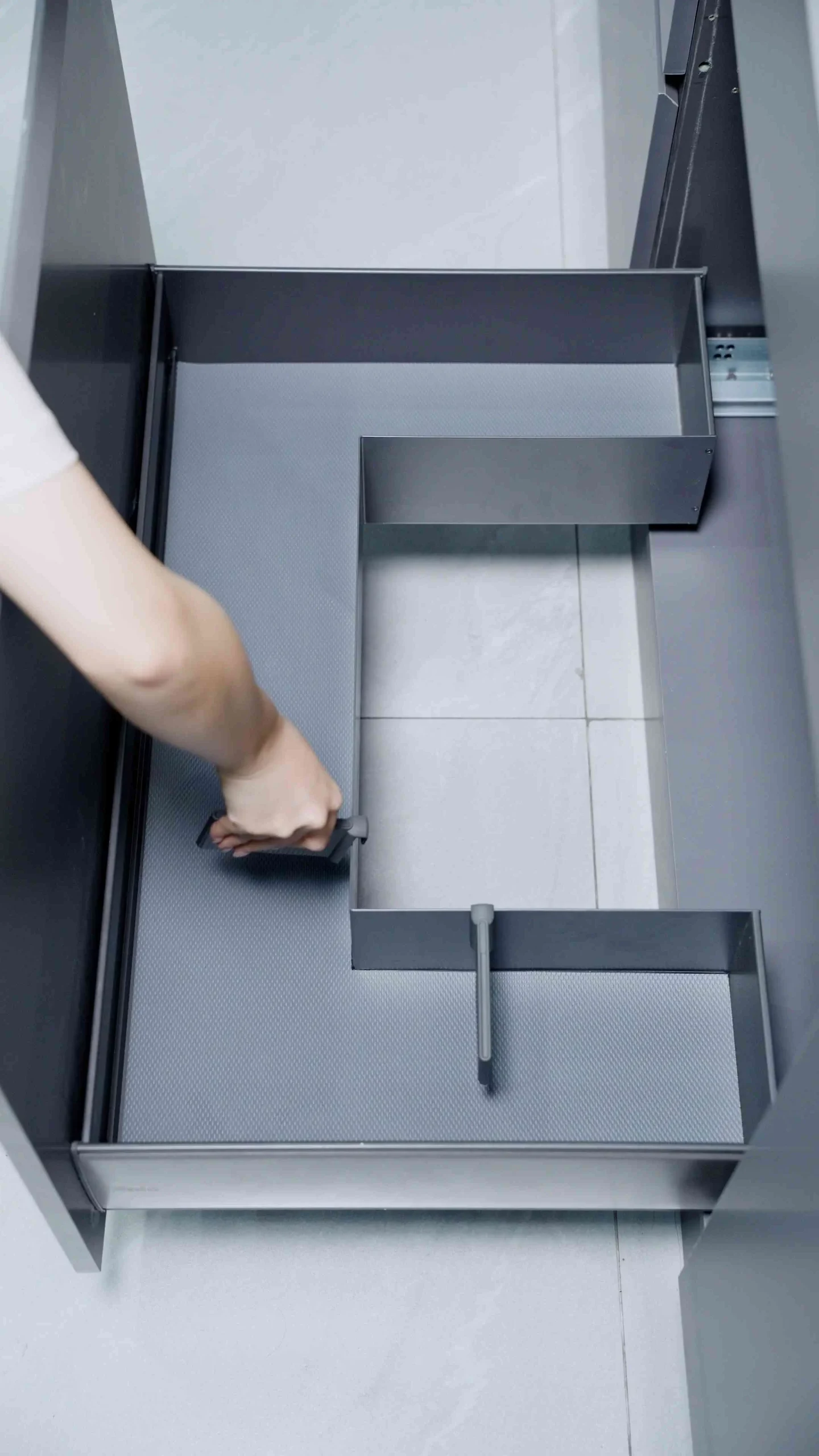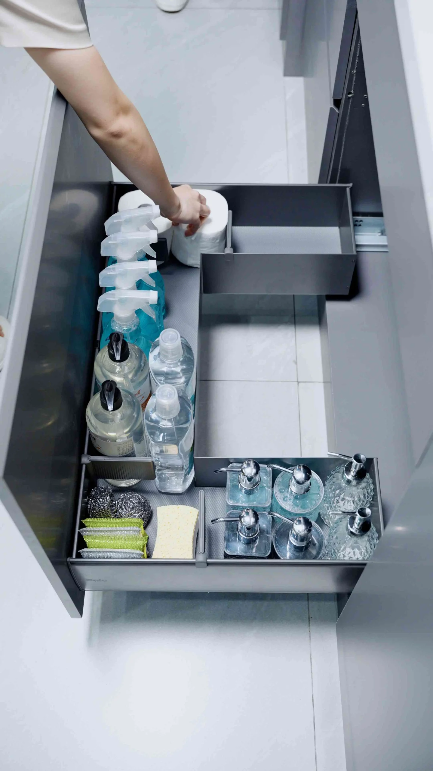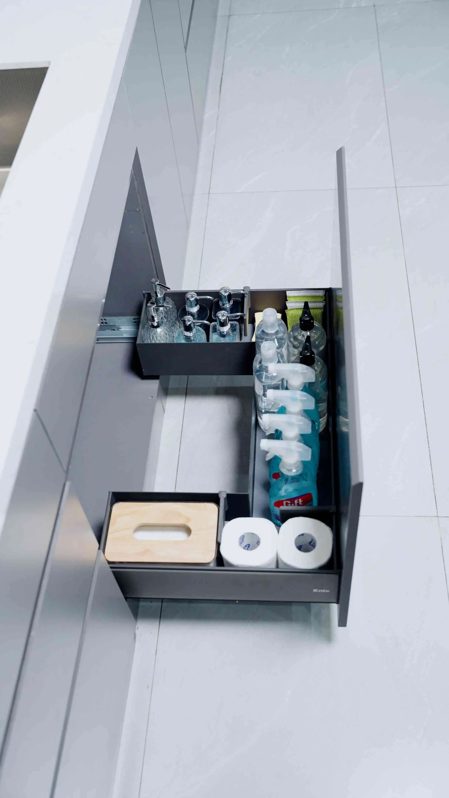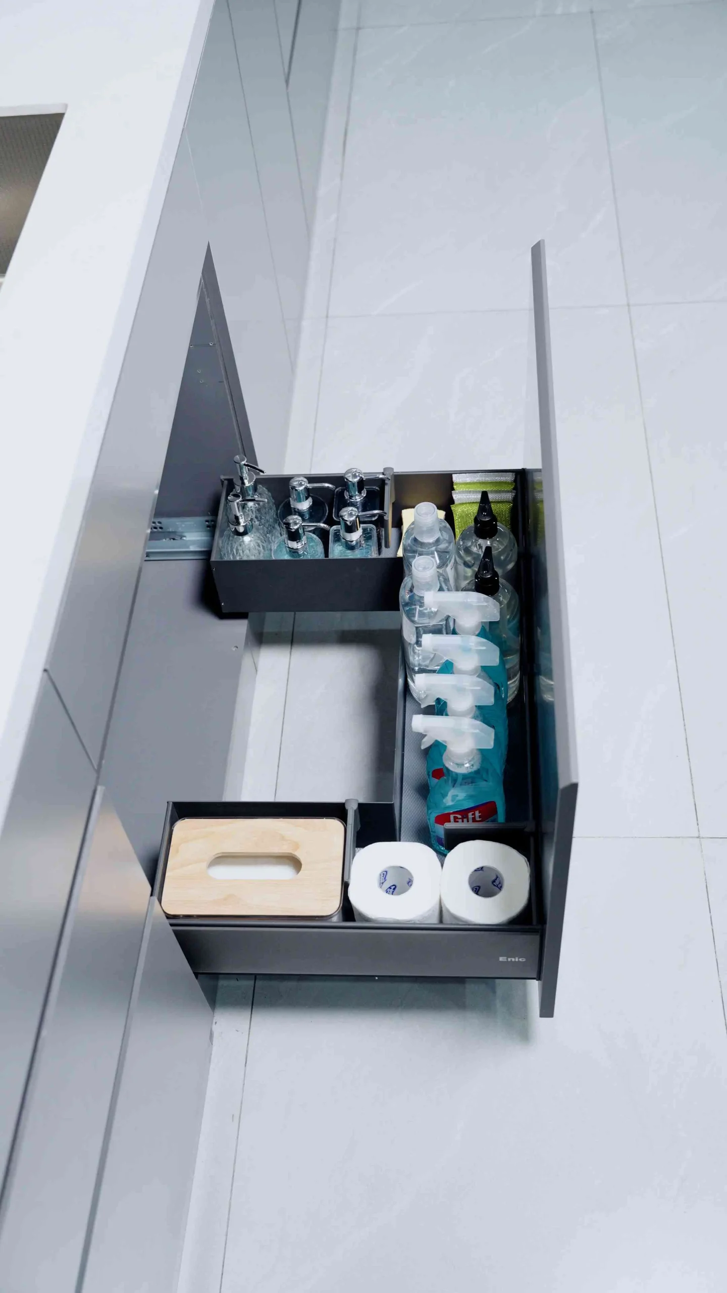 Lấp đầy khoảng trống dư thừa, khai thác góc khuất thông minh cùng Ngăn kéo chữ U đựng chất tẩy rửa Enic Elite.