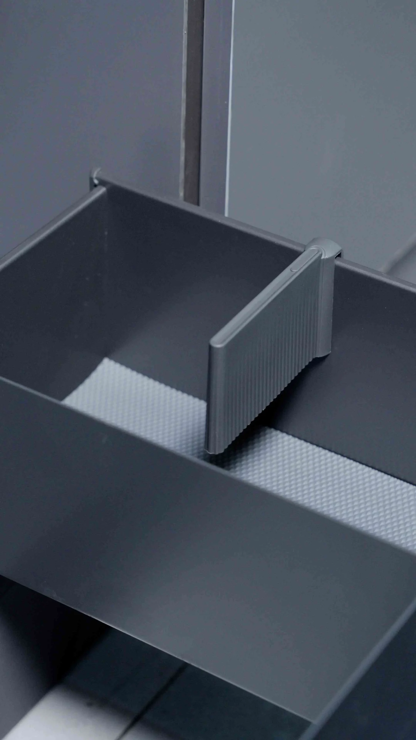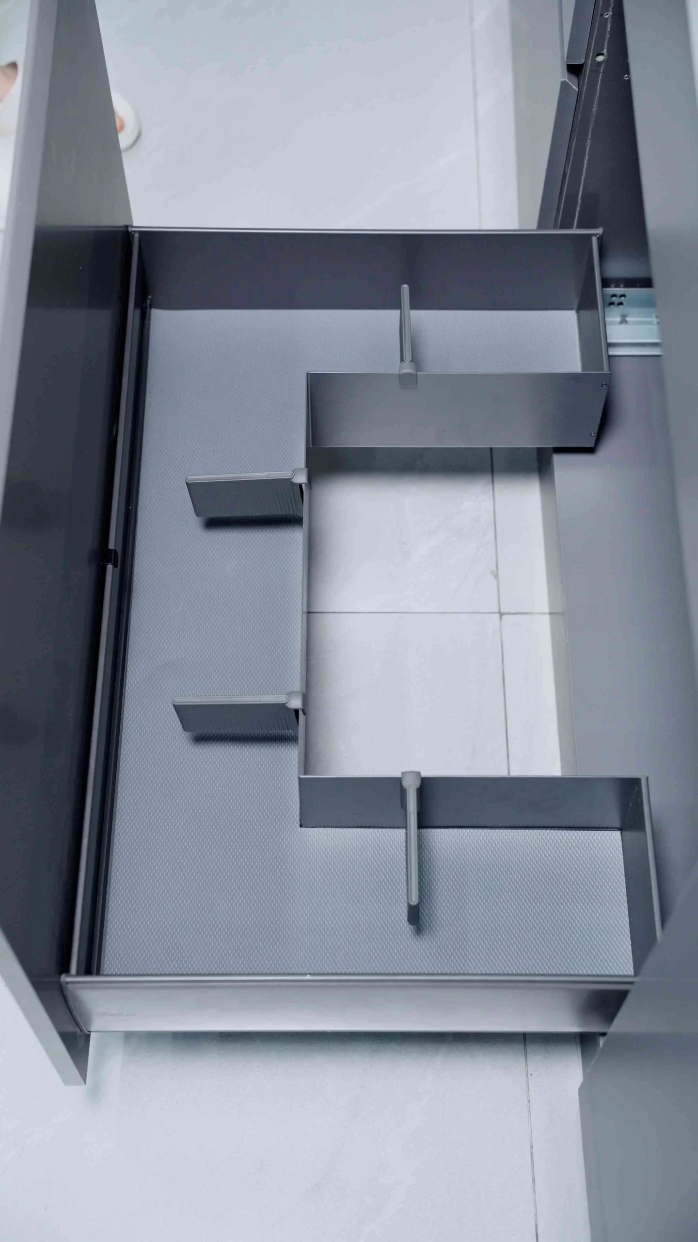 Với cấu trúc rỗng ở giữa tạo thành hình chữ U, ngăn kéo dễ dàng ôm trọn lấy đường ống xả của khu vực bồn rửa mà không gây cấn hay vướng víu. Hai bên thành chữ U cung cấp không gian lý tưởng để bạn cất giữ gọn gàng các loại chai lọ tẩy rửa, nước rửa chén, cọ xoong nồi hay bọt biển thay vì bày bừa trên mặt bếp. Cấu trúc đi kèm các tấm chia ngăn khoa học giúp chai lọ luôn đứng vững, không bị xô lệch khi đóng mở.