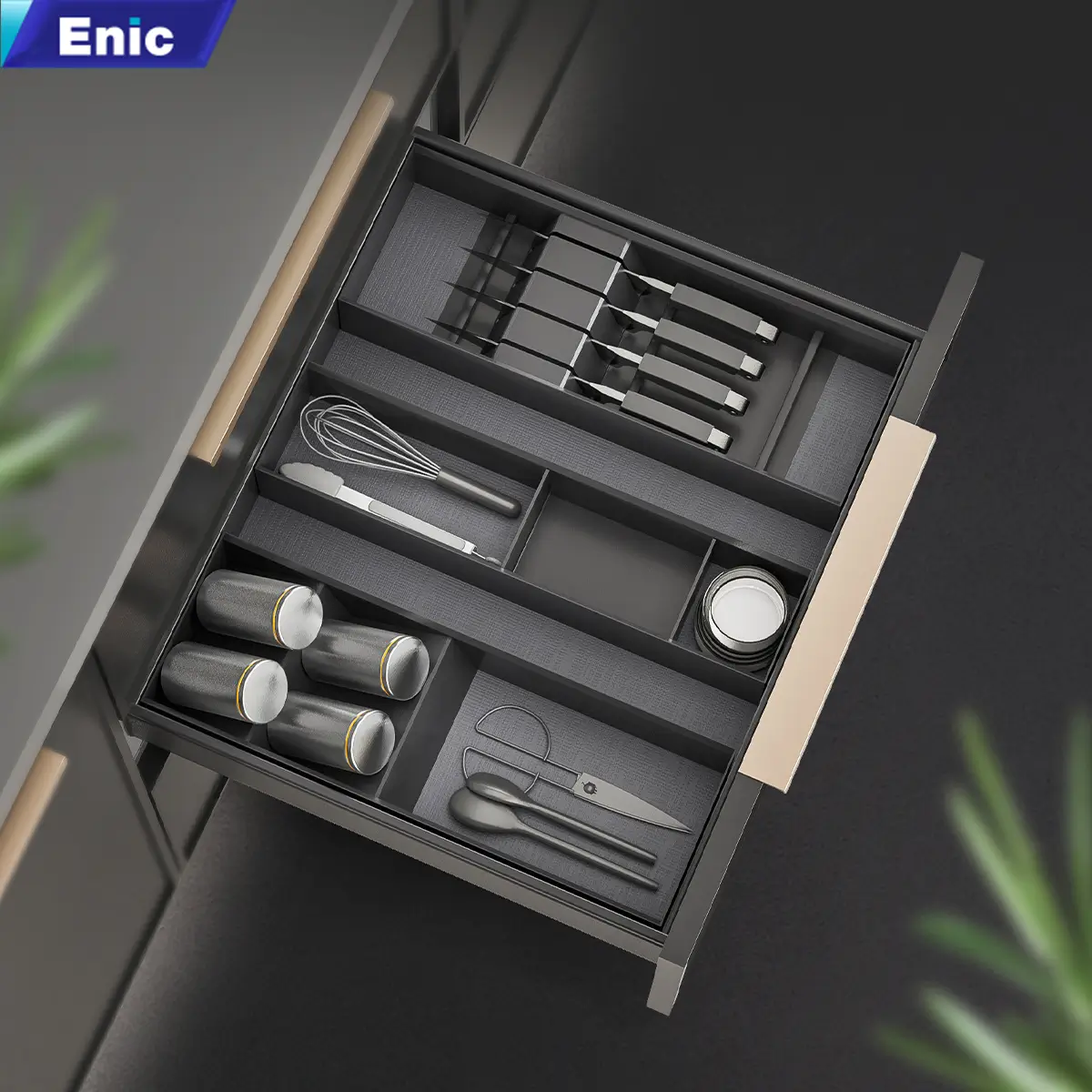 Giải quyết hoàn toàn tình trạng thất lạc dụng cụ nấu nướng với Ngăn kéo đựng muỗng đũa cao cấp Enic Elite. Đây không chỉ là một ngăn chứa bình thường, mà là một hệ thống phân loại phụ kiện nhà bếp đẳng cấp giúp bạn tối ưu hóa từng centimet không gian và mang lại sự cảm hứng trong mỗi lần vào bếp.