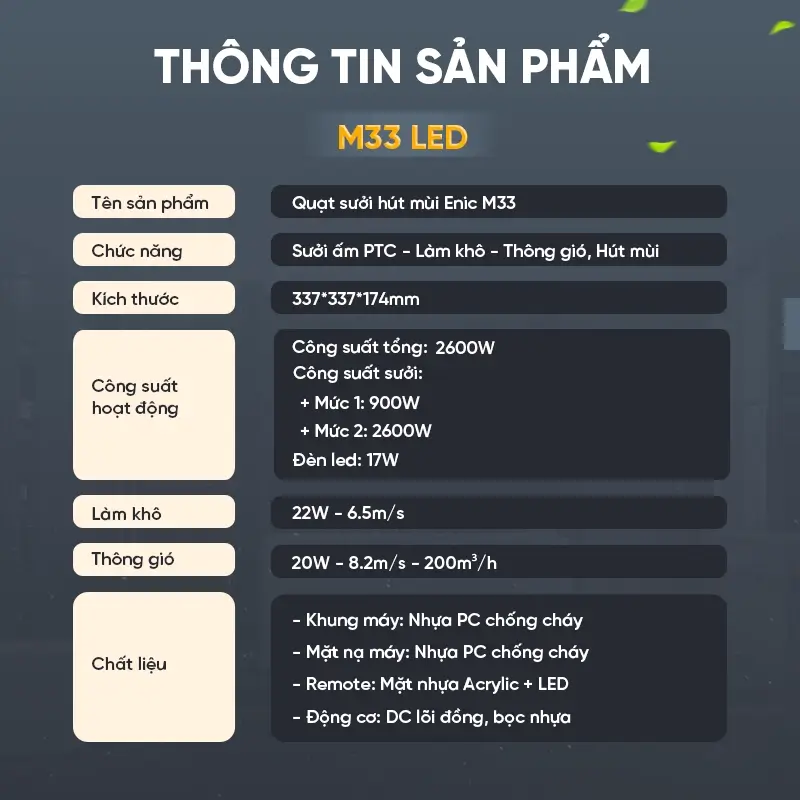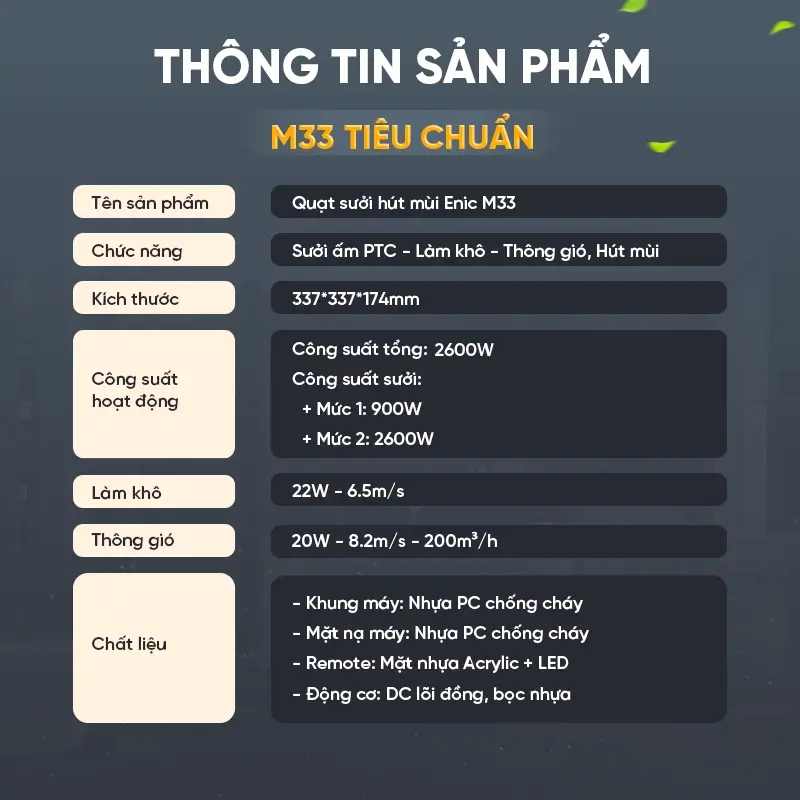 Phòng tắm của bạn giờ đây không chỉ sạch sẽ mà còn luôn ấm áp, khô thoáng và không mùi nhờ quạt sưởi hút mùi âm trần Enic M33. Thiết bị này tích hợp 3 chức năng trong 1 – sưởi ấm, làm khô và hút mùi – giúp bạn tận hưởng cảm giác dễ chịu ngay cả trong những ngày thời tiết lạnh ẩm nhất.