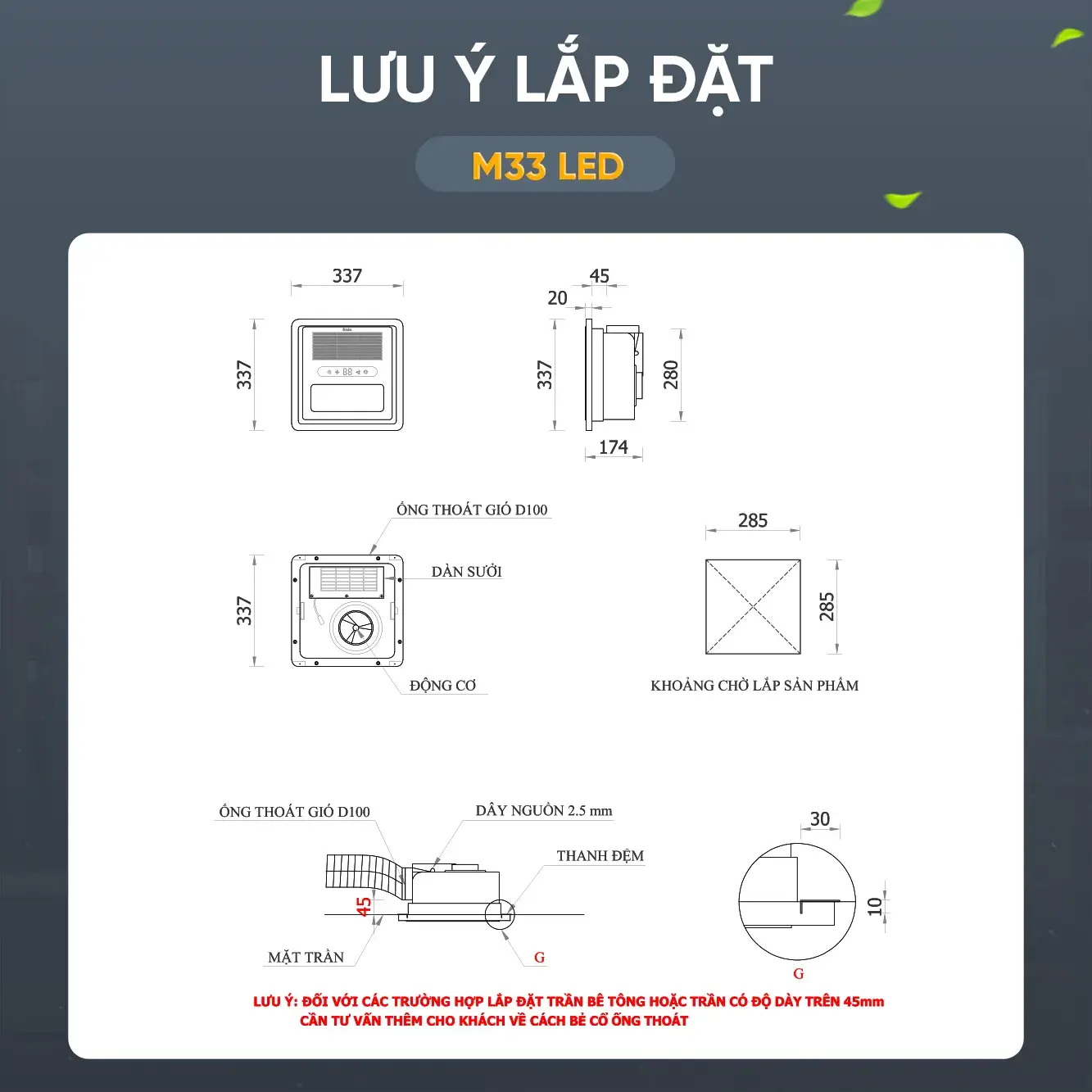 Mọi thao tác với quạt sưởi hút mùi âm trần M33 đều đơn giản nhờ màn hình LED hiển thị chức năng và remote điều khiển từ xa tiện dụng. Về thiết kế, quạt sở hữu mặt nạ bằng nhựa PC bền nhẹ và động cơ lõi đồng giúp thiết bị vệ sinh hoạt động ổn định, bền bỉ lâu dài. Với kích thước gọn gàng 28.5 x 28.5cm, quạt