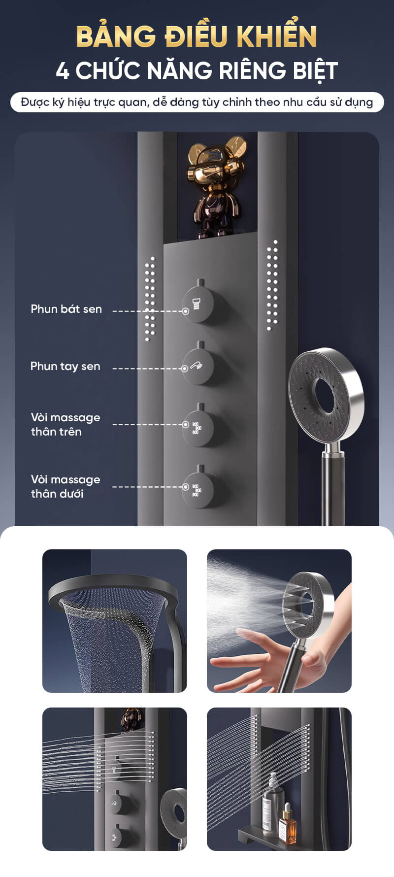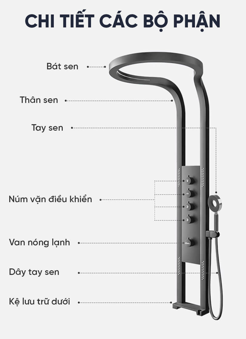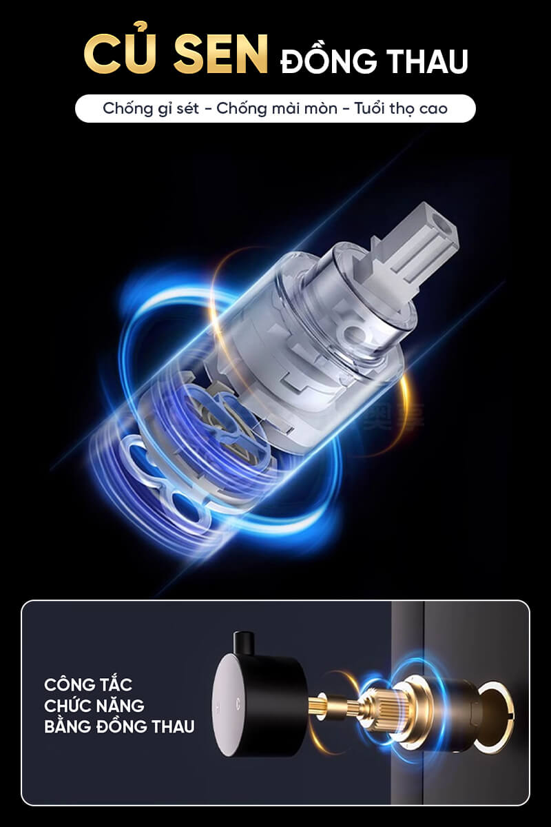 trải nghiệm được 1 tuần ok nên quay lai đánh giá, bát sen rộng đứng tắm tia nước ôm hết cơ thể thư giãn lắm, các nút vặn chuyển tia nước nhẹ êm, ít bị nhầm như loại dùng chung 1 núm vặn, ký hiệu dễ hiểu không sợ bấm nhầm ước người.