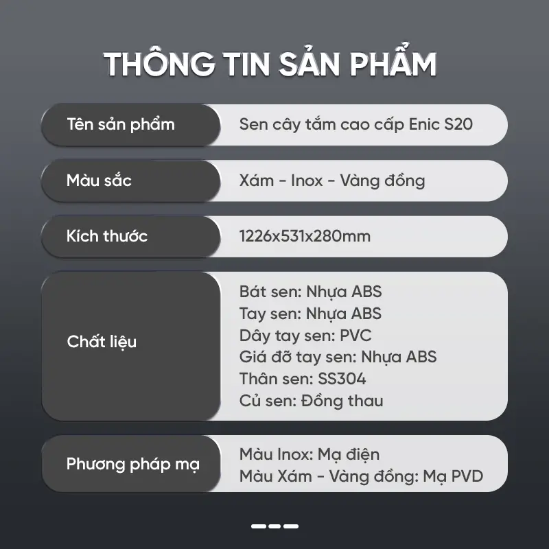 Nâng tầm không gian tắm với Sen cây tắm cao cấp Enic S20 – một Thiết bị vệ sinh kết hợp hài hòa giữa công năng tiện ích và thiết kế đẳng cấp. S20 là lựa chọn hoàn hảo để thay thế Sen tắm truyền thống, mang đến vẻ đẹp hiện đại và trải nghiệm thư giãn vượt trội.
