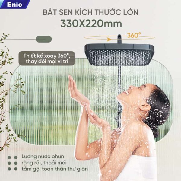 Với bát sen hình chữ nhật lớn, sen cây tắm cao cấp Enic S35 mang đến trải nghiệm tắm thoải mái hơn nhờ dòng nước phủ rộng và đều. Không cần thao tác phức tạp, bạn có thể chuyển chế độ nước chỉ bằng một nút bấm, kết hợp với thanh gạt điều chỉnh nóng lạnh mượt mà, ai cũng có thể sử dụng dễ dàng.