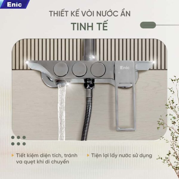 Với sen cây tắm Enic thì việc lắp đặt cũng trở nên đơn giản hơn, chỉ cần khoảng cách đường ống 15cm, phù hợp với hệ thống nước tiêu chuẩn. Nếu muốn áp lực nước mạnh hơn, bạn có thể kết hợp bơm tăng áp 200W để tăng hiệu quả.
