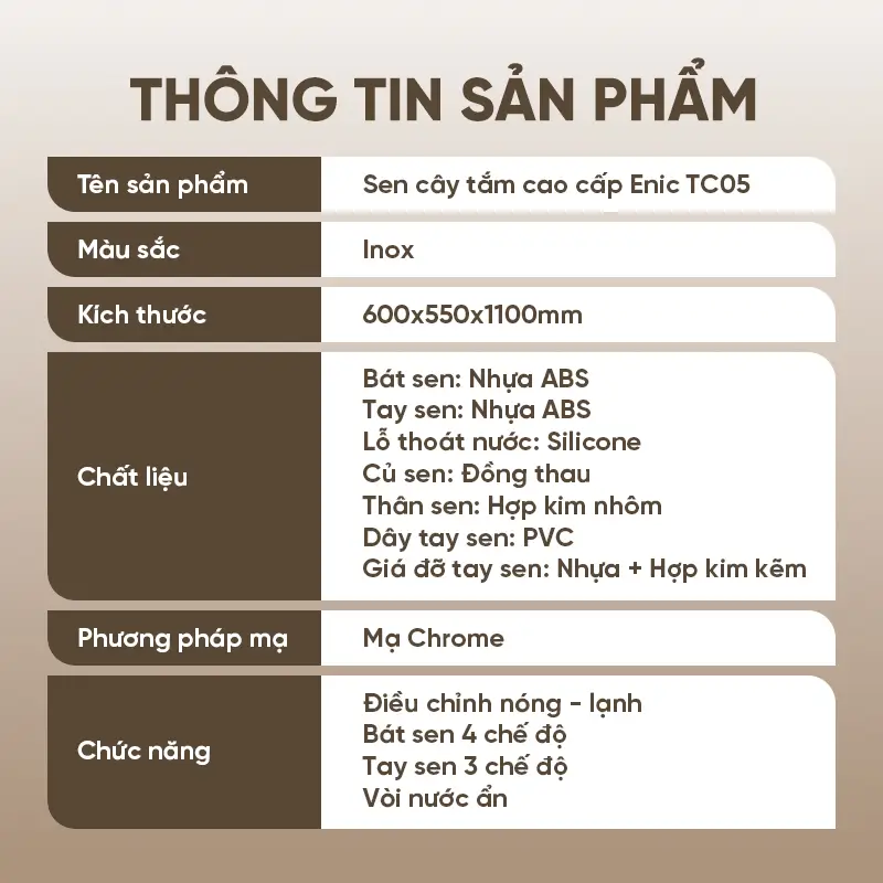 Củ sen còn được thiết kế với Mặt kính cường lực rộng rãi, tăng diện tích để đồ dùng cá nhân. Về chất liệu, củ sen làm từ Đồng thau bền bỉ, thân sen bằng Hợp kim nhôm, và được mạ Chrome sáng bóng. Enic TC05 là sự lựa chọn đẳng cấp cho không gian tắm sang trọng của bạn.