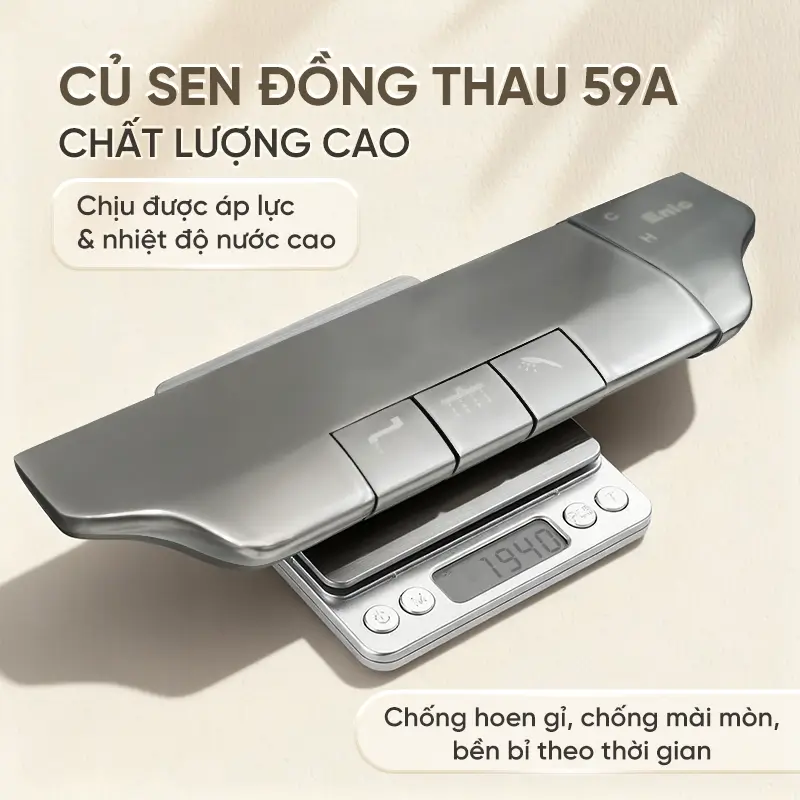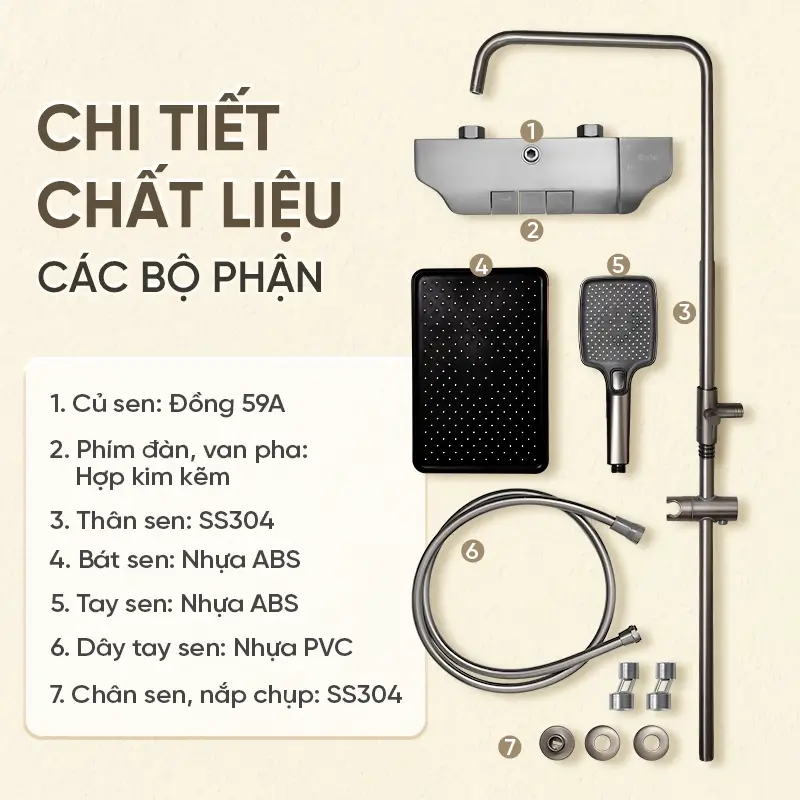 Sản phẩm được chế tạo từ những vật liệu chất lượng nhất để đảm bảo tuổi thọ lâu dài: Củ sen làm từ Đồng 59A cao cấp, thân sen bằng Inox SS304 chống gỉ sét. Bát sen và tay sen sử dụng nhựa ABS bền nhiệt. Đặc biệt, công nghệ mạ PVD tiên tiến giúp bề mặt sen luôn sáng bóng và sang trọng.