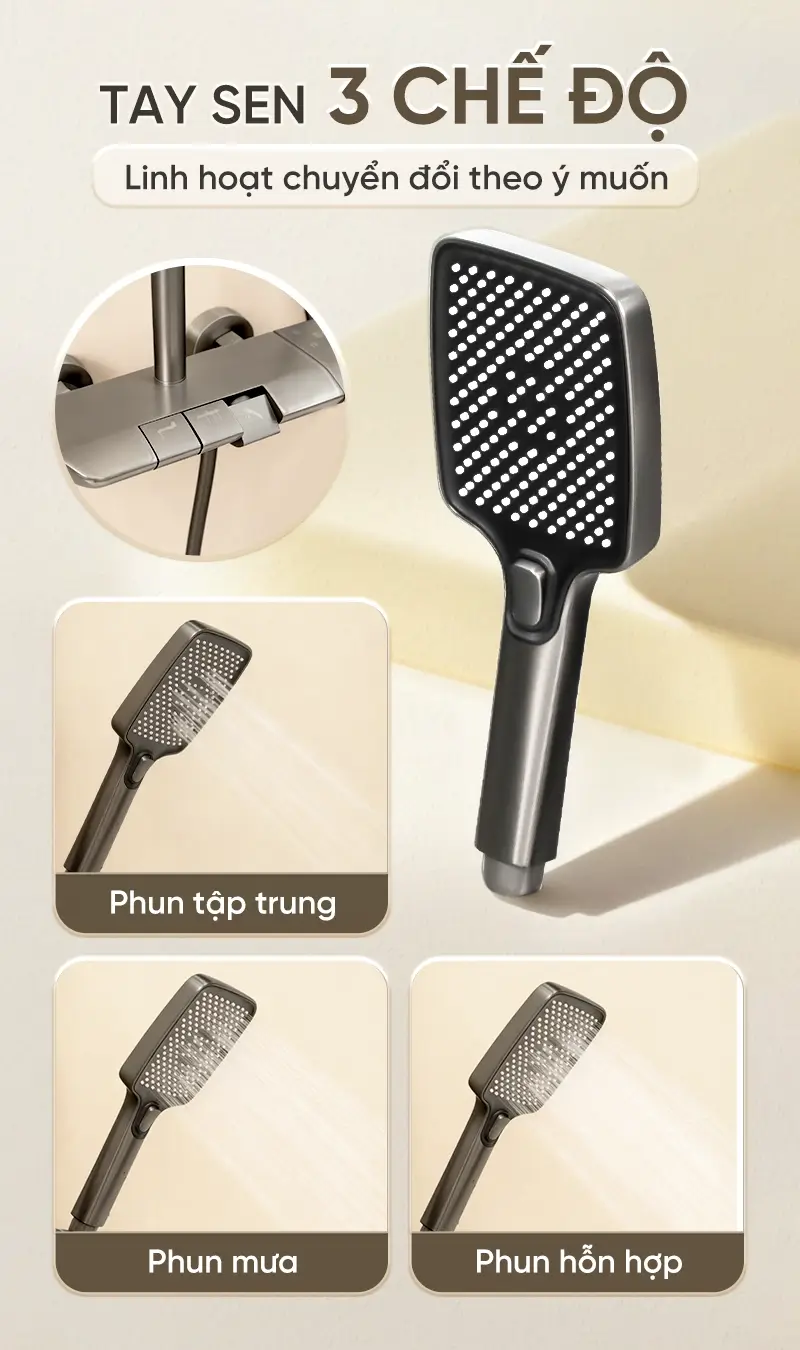 Tay sen 3 chế độ phun linh hoạt, đáp ứng mọi nhu cầu từ tắm nhẹ nhàng đến massage.