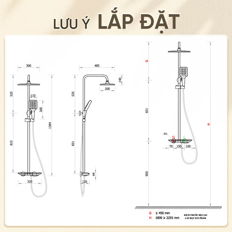 Lưu ý lắp đặt: Để đảm bảo tia nước phun mạnh và đều, sản phẩm yêu cầu áp lực nước từ 1.5 – 2.24kg/cm² hoặc sử dụng bơm tăng áp 200W.