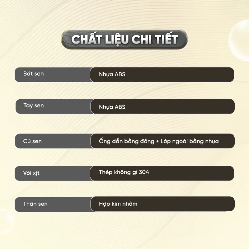 Với chất liệu đồng thau 59A, hợp kim nhôm, nhựa ABS cao cấp, sen tắm Enic TD40 đảm bảo độ bền theo thời gian. Nếu bạn muốn nâng cấp trải nghiệm tắm mỗi ngày, đây chính là lựa chọn mà bạn không thể bỏ qua!