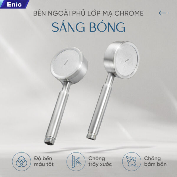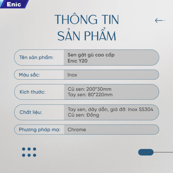 Thiết kế của sen gật gù Enic Y20 nổi bật với củ sen bằng đồng cao cấp cho khả năng chống ăn mòn, chịu áp lực tốt và tuổi thọ lâu dài. Bộ phận tay sen, dây sen và giá đỡ được làm từ Inox SS304, đảm bảo độ chắc chắn và khả năng chống gỉ sét tuyệt đối. Toàn bộ bề mặt được mạ Chrome sáng bóng, vừa tăng tính thẩm mỹ vừa giúp dễ dàng vệ sinh, duy trì vẻ mới đẹp lâu dài.