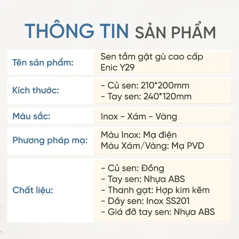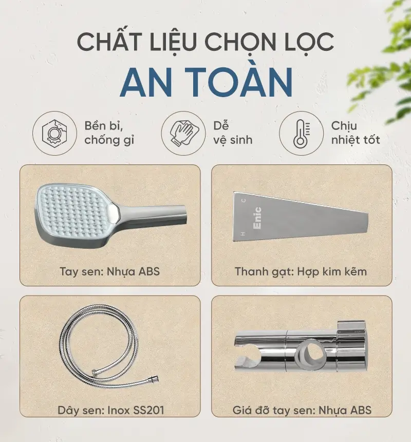 ban đầu cũng nghi nghi lớp sơn đụng nước vài bữa là tróc ra rồi rỉ sét hết, mà bên enic tư vấn kêu có mạ điện gì đó, chống trầy tốt lắm, xài tới giừ 5 tháng rồi thấy đúng nha, cây sen còn sáng bóng, dễ lau chùi lắm