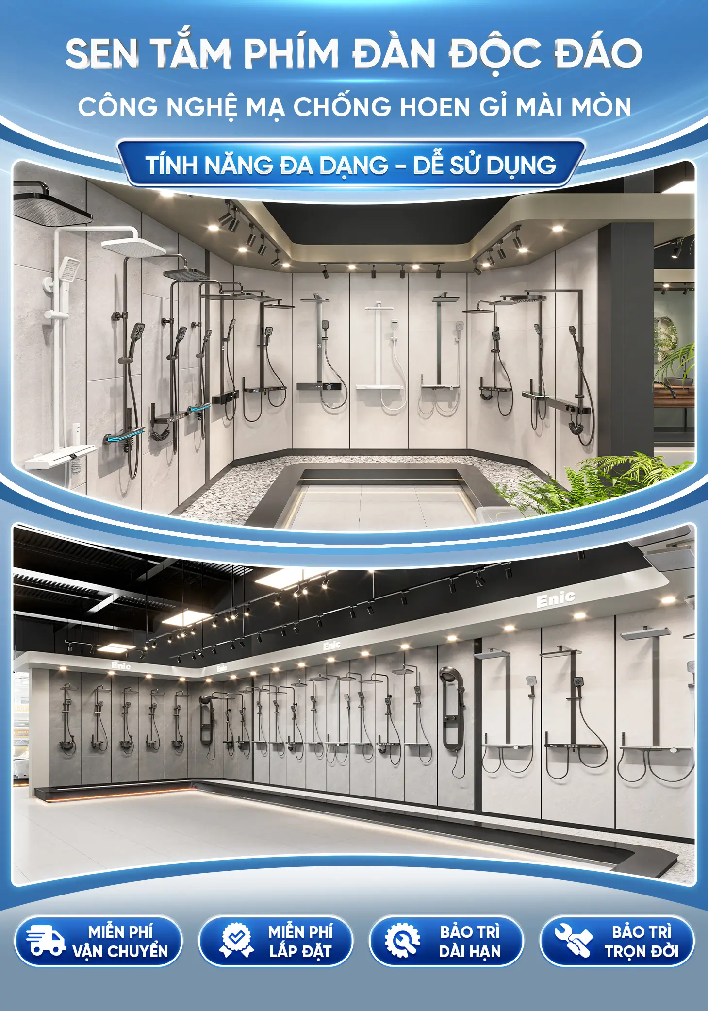 - Đa dạng mẫu mã: Enic mang đến hai kiểu thân sen phím đàn là thân tròn mềm mại, tinh tế, dễ kết hợp với nhiều không gian phòng tắm và thân dẹp mỏng, góc cạnh, hiện đại phù hợp với không gian rộng.