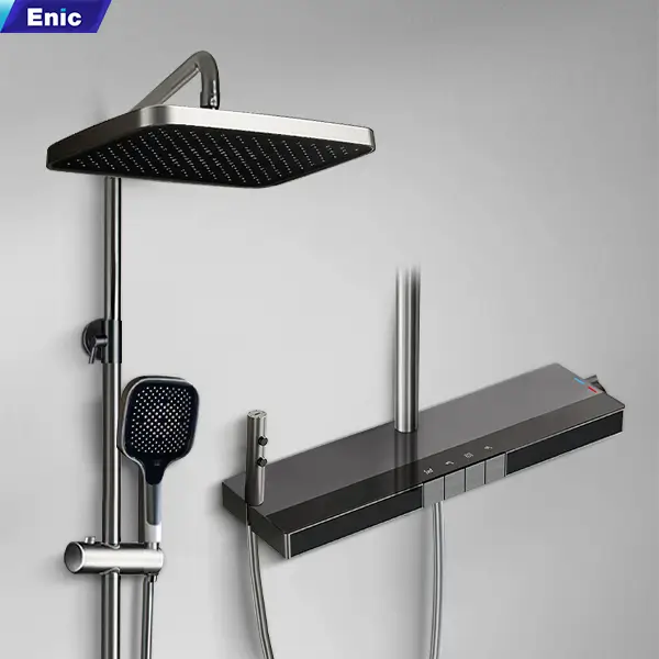 Bộ sen tắm có thiết kế đơn giản gồm 1 ống mềm dẫn nước trực tiếp đến đài sen. Ưu điểm vượt trội của bộ vòi sen từ thương hiệu Enic là cảm ứng phím đàn. Và bảng điều khiển rất dễ dàng điều khiển đặc biệt là theo dõi nhiệt độ sử dụng nước liên tục và chế độ đang được sử dụng.